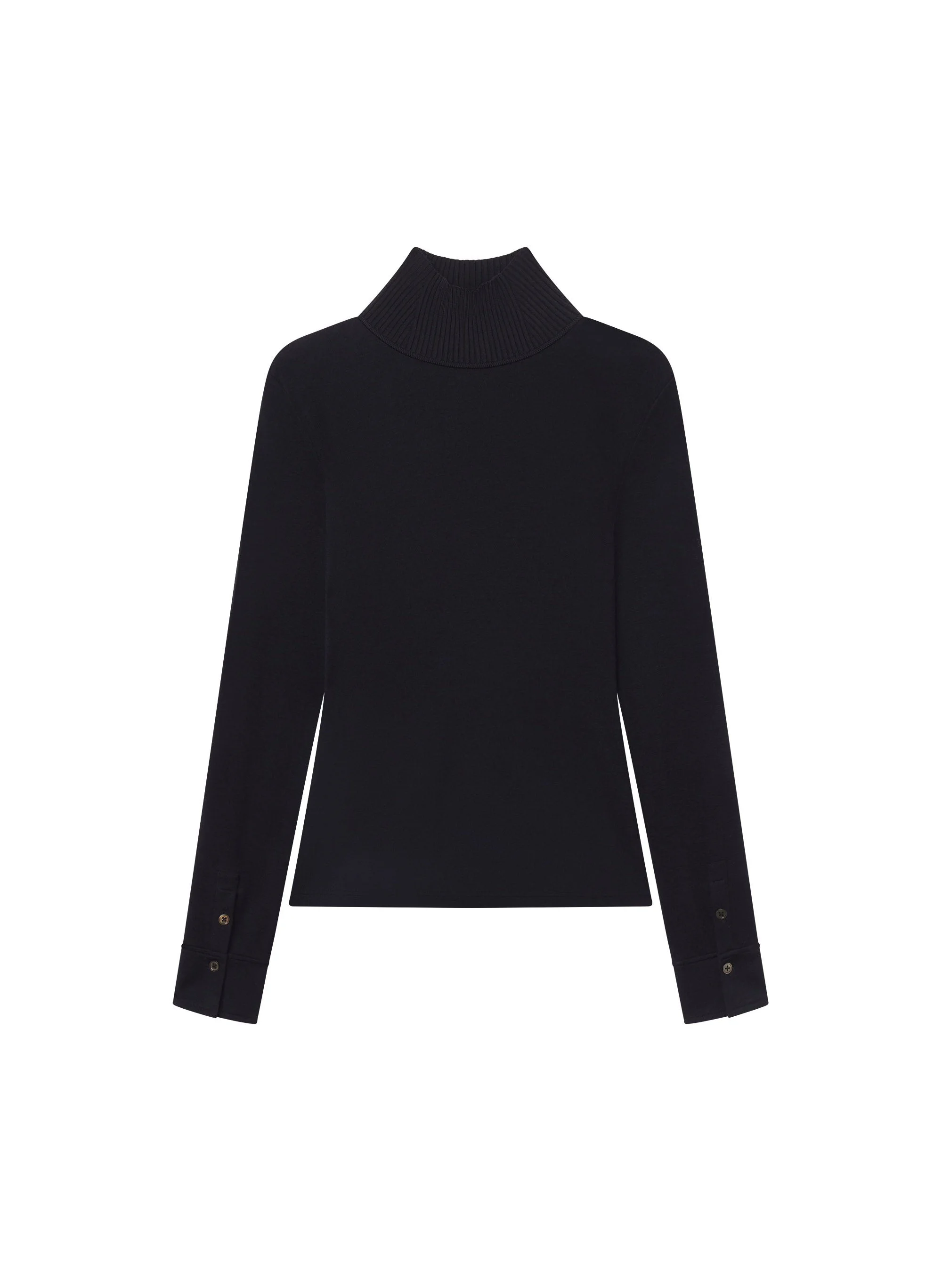 Lightweight and versatile, the Elyse Top is crafted from an Italian semi-sheer sleek stretch-blend jersey. The fitted silhouette is finished with a ribbed neckline and buttoned cuffs, and offered in a deep navy hue. - Italian stretch-jersey fabric - Fitted silhouette - Ribbed neckline - Buttoned cuffs - Lightweight and versatile for layering SIZE & FIT - Model is 5'9.5" Wearing Size S - Bust 32.5" Waist 24.5" Hips 35.5" - Product Measurements for a Size S: Bust 33.5" Waist 31" DETAILS - Style 8KTOP00874 - 100% Wool, contrast: 100% Rayon - Dry Clean - Not Lined - Pull On - Length: 22.25"