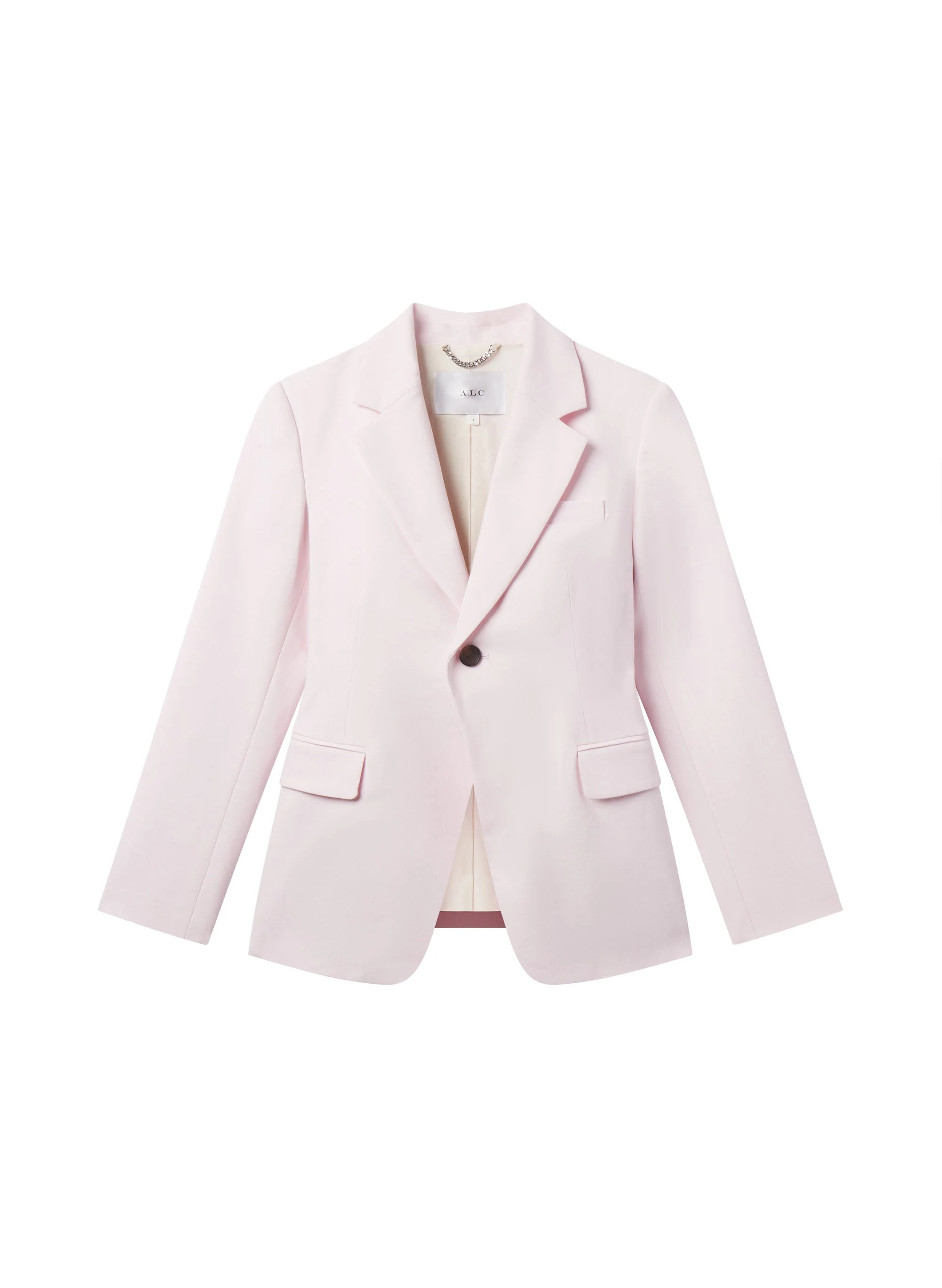 The Elza Jacket is crafted from cotton-viscose tailoring with lightweight structure and subtle stretch in a soft Cherry Blossom hue. This sharp-shouldered silhouette features peak lapels, a single-button closure that nips the waist, and a clean cutaway front. SIZE & FIT - Model is 5'9.5" Wearing Size 2 - Bust 30.5" Waist 23" Hips 34" - Product Measurements for a Size 4: Bust 34.5" Waist 31.5" DETAILS - Style 1JAKT01165 - 50% Cotton 47% Viscose 3% Elastane - Dry Clean - Not Lined - Button Closure - Length: 27.75"