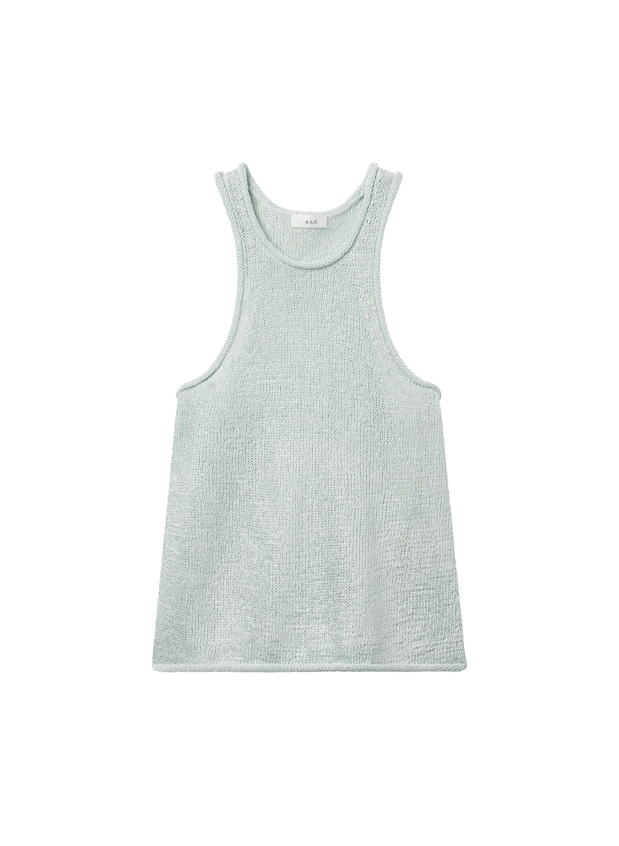 The Nelly Top is crafted from our luxe viscose, a finely woven knit with an ultra-soft, delicate drape and a subtle sheen in a pale mint hue. This slim silhouette features a racer back, pointelle detailing at the shoulders, and a rolled neckline and hems lend a fresh, undone finish. SIZE & FIT - Model is 5'10" Wearing Size S - Bust 32" Waist 23" Hips 35" - Product Measurements for a Size S: Bust 29" Waist 29.5" DETAILS - Style 7SWTP00689 - 70% Viscose 30% Polyamide - Dry Clean - Not Lined - Button Closure - Length: 21.25"