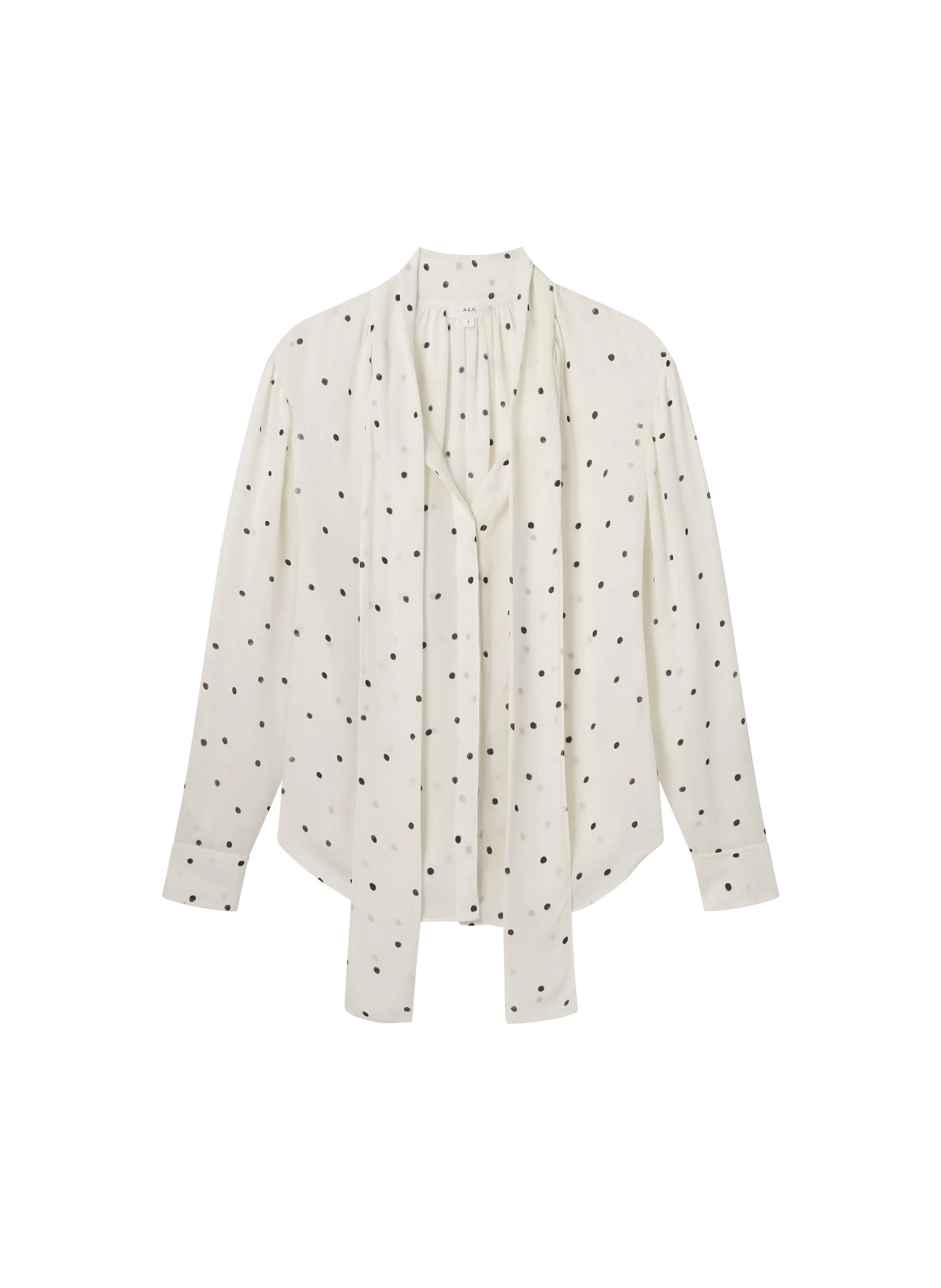 The Viv Top is crafted from fluid silk with a soft sheen and a lightweight drape. Designed in a cream base with a scattered dot motif, this timeless silhouette features a relaxed fit with a self-tie scarf neckline and buttoned cuffs. - Relaxed silhouette with fluid drape - Crafted from 100% silk with a soft sheen - Cream base with a modern dot motif - Tie-neck detail for versatile styling - Buttoned cuffs and subtle gathering at the shoulders SIZE & FIT - Model is 5'9.5" Wearing Size 2 - Bust 32" Waist 25.5" Hips 33.5" - Product Measurements for a Size 4: Bust 44" Waist 44" DETAILS - Style 5TOPS02019 - 100% Silk - Dry Clean - Not Lined - Button Closure - Length: 26"