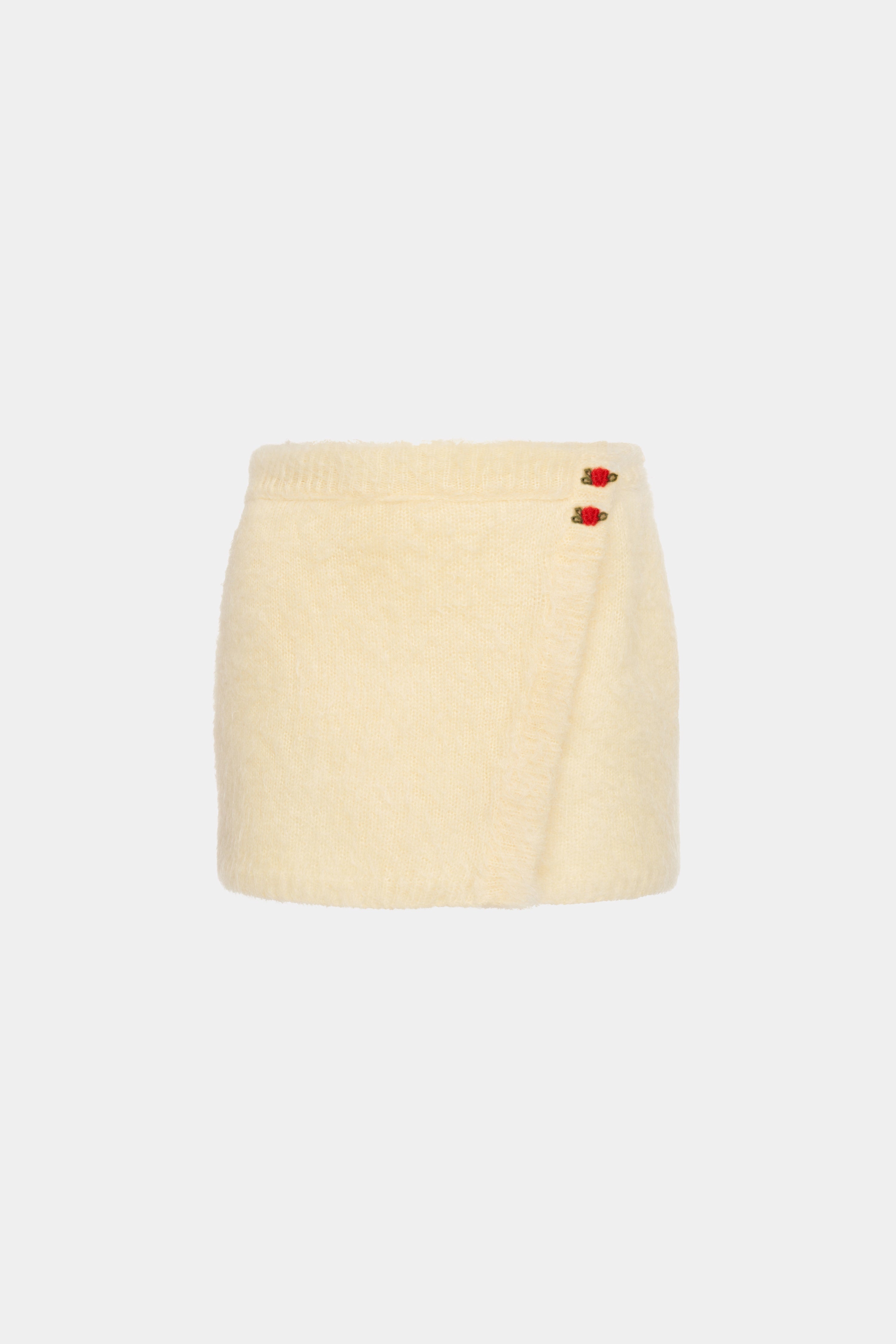 Carded mohair knit mini skirt with embroidery Composition 50% mohair 32% polyamide 18% wool Embroidery: 63% mohair 37% polyamide Colour: pale yellow Made in Italy Product code: FABX4188 K4603 9088