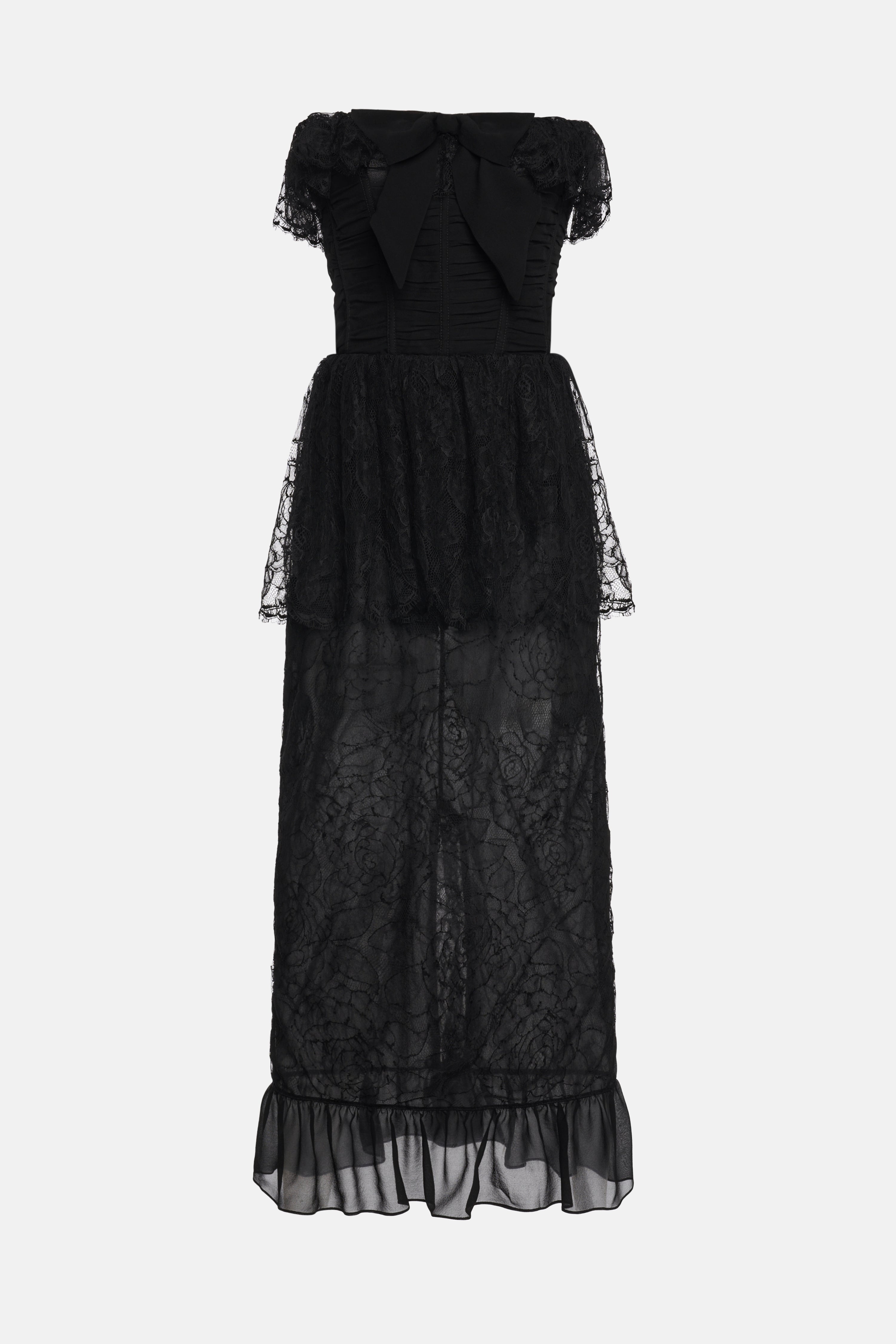 Lace and silk georgette bustier dress Composition 55% cotton 45% polyamide Bow: 100% silk Lining: 78% polyamide 22% elastane Colour: black Made in Italy Product code: FABX4152 P4605 0900
