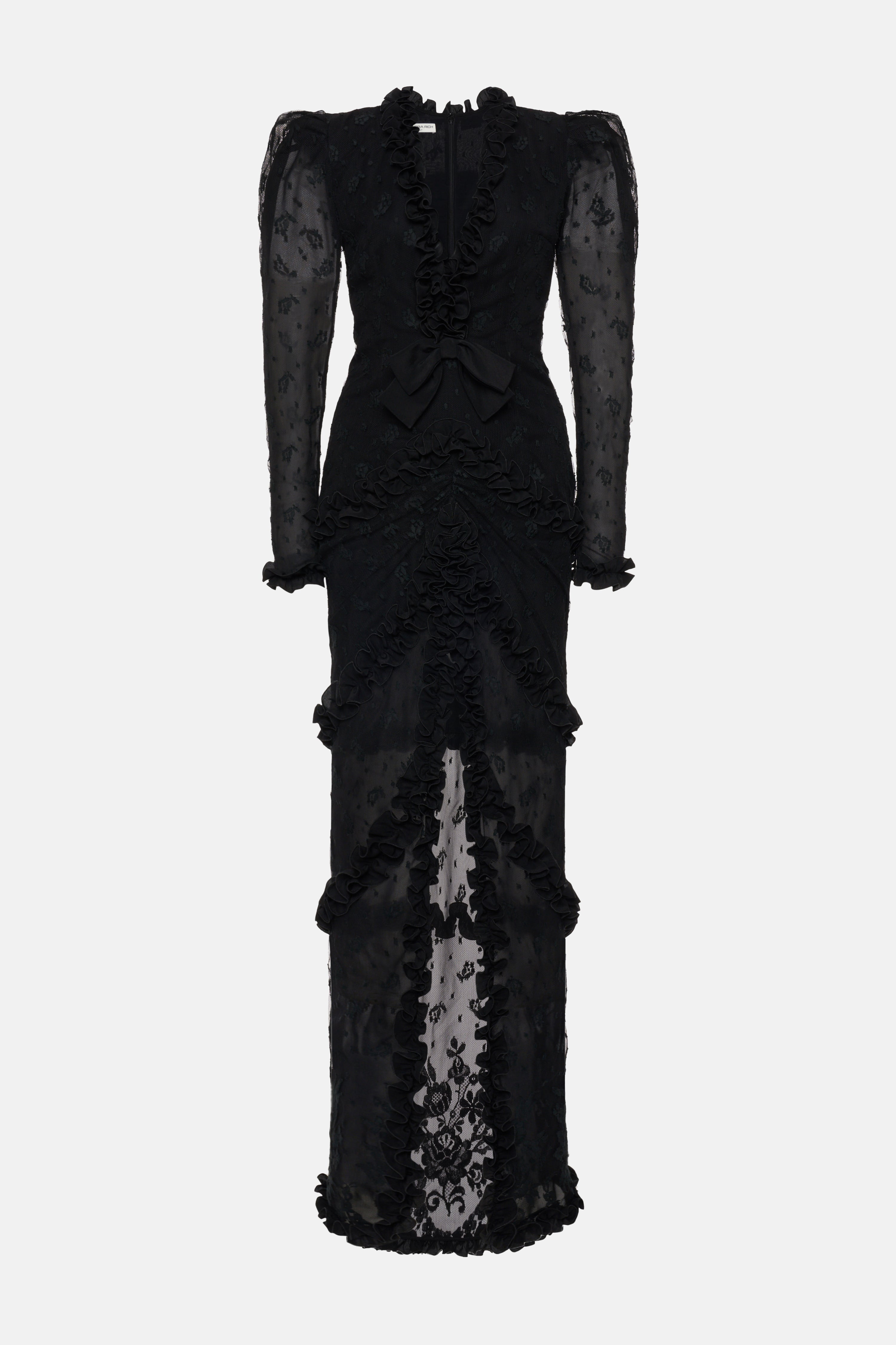 Lace v-neck dress with ruffles Composition 60% cotton 40% polyamide Lining A: 100% silk Lining B: 78% polyamide 22% elastane Lining C: 100% polyamide Colour: black Made in Italy Product code: FABX4089 P4582 0900