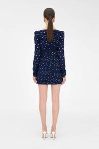 Polka dot print draped mini dress with bows Composition 55% polyamide 34% cotton 11% polyester Lining: 100% polyester Colour: navy blue-white Made in Italy Product code: FABX4125 F4655 1643