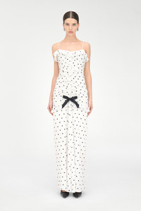 Polka dot print silk dress with bow and split Composition 100% silk Bow: 100% silk Lining: 100% polyester Colour: white-navy blue Made in Italy Product code: FABX4134 F4655 0822