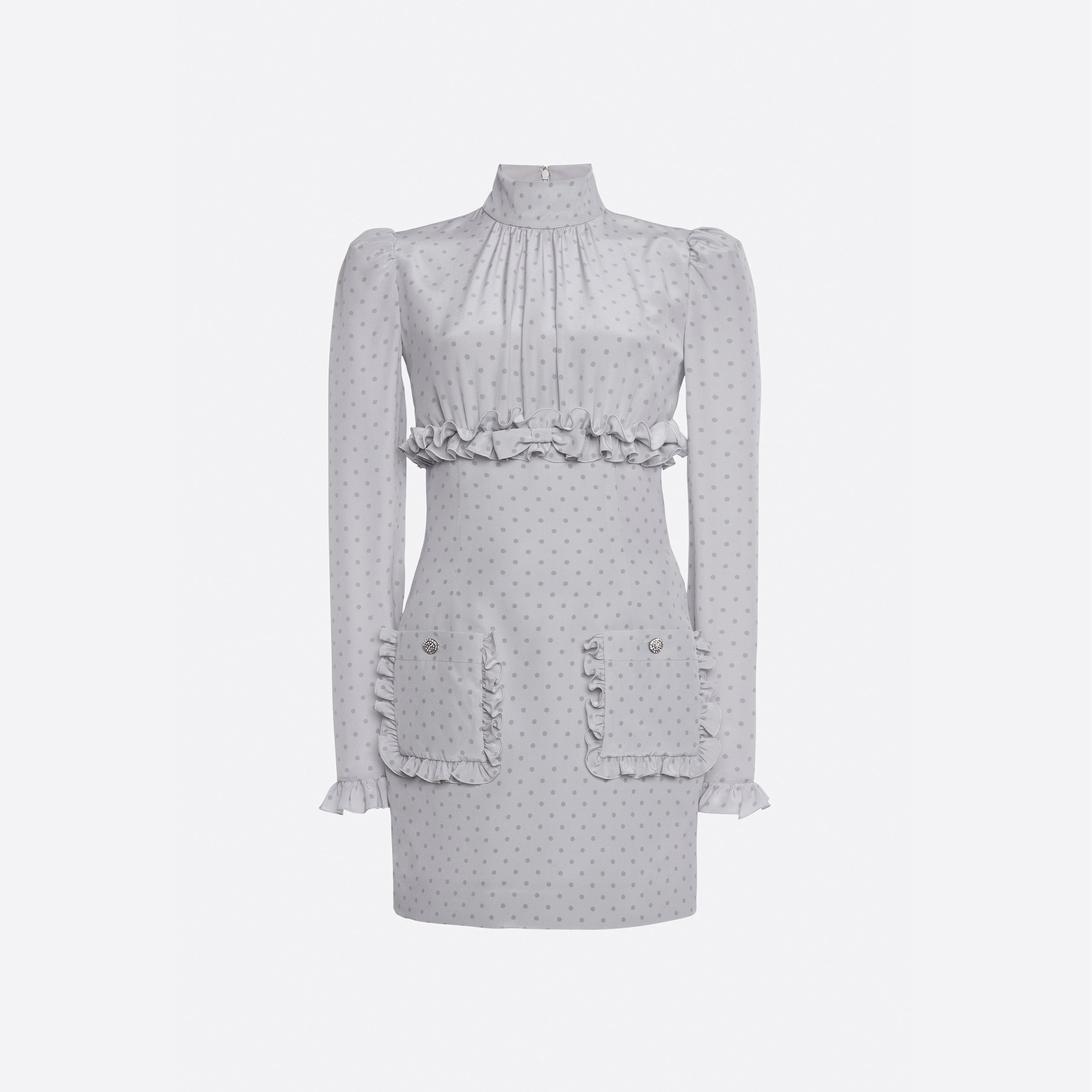 Polka dot print silk mini dress with ruffles Composition 100% silk Ruffles: 100% silk Lining: 100% polyester Lining 2: 100% polyamide Colour: grey-grey Made in Italy Product code: FABX4302 F4686 1810