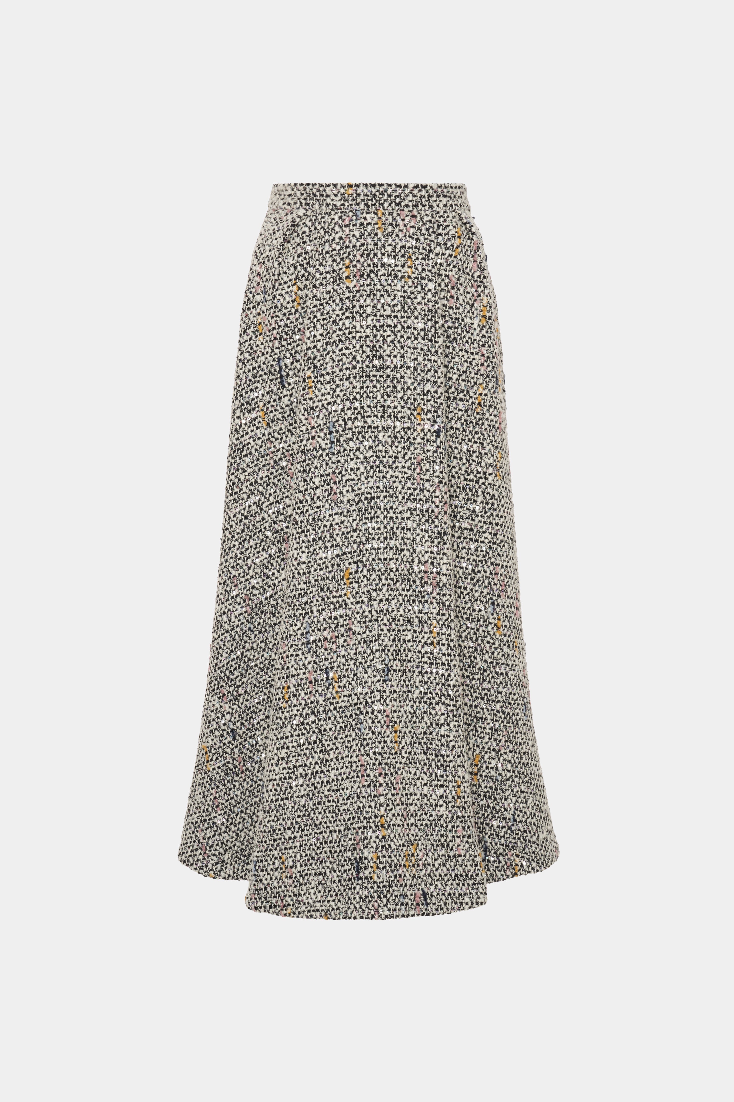 Sequin tweed round long skirt Composition 67% virgin wool 22% polyamide 9% polyester 2% alpaca wool Lining: 100% polyester Colour: white melange-multi Made in Italy Product code: FABX4221 F4589 0822