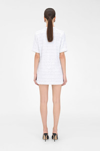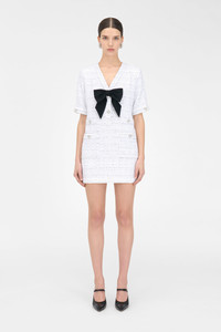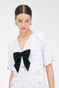 Sequin tweed mini dress with bow Composition 55% polyamide 34% cotton 11% polyester Bow: 96% virgin wool 3% polyamide 1% elastane Lining: 100% polyester Colour: white-black Made in Italy Product code: FABX4115 F4597 0822