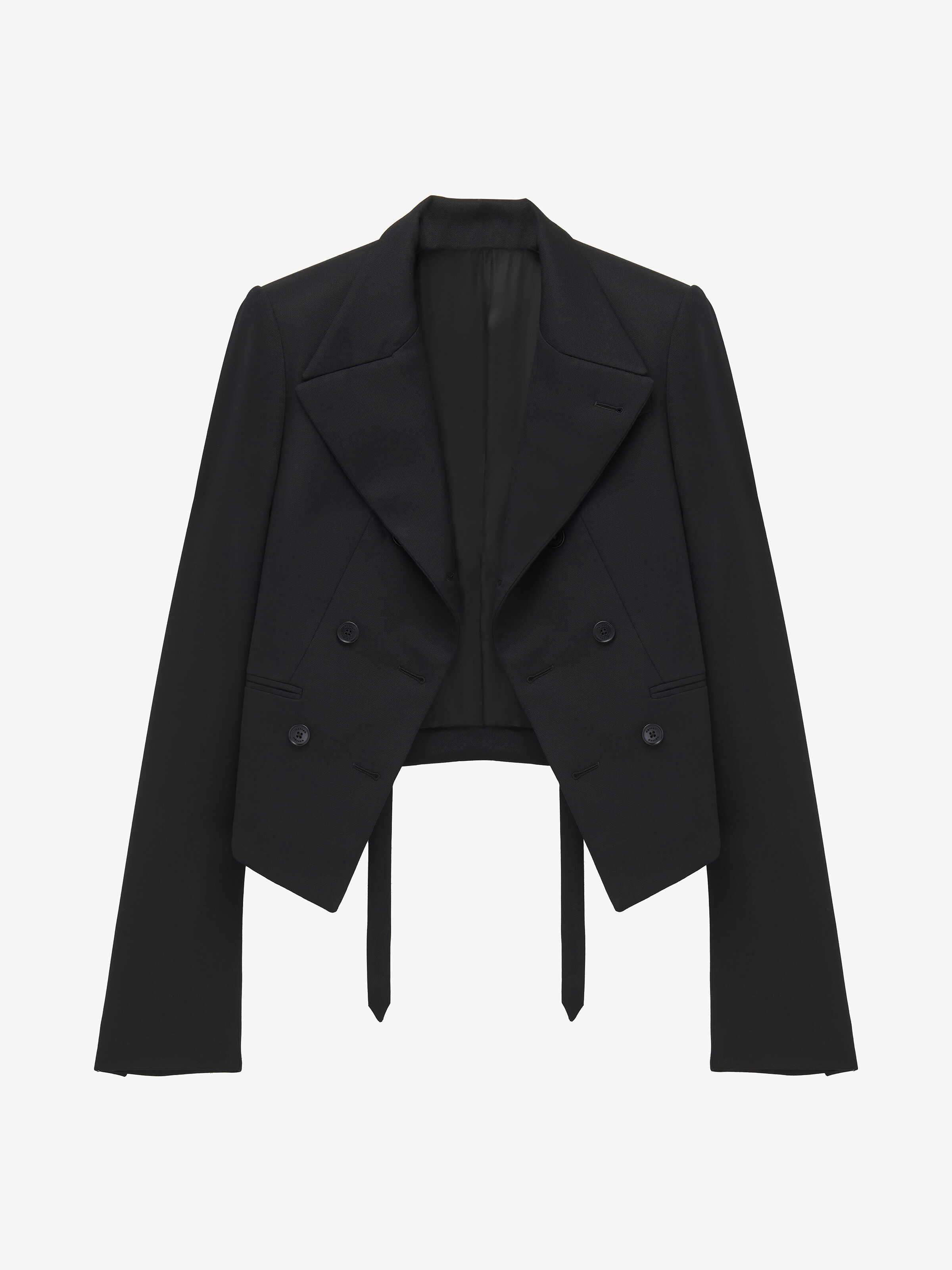 Double-breasted jacket in black English wool gabardine with asymmetric lapels. Slit pocket on the chest, side jetted pockets and back tie detailing. Finished with a T-Bar chain back detail. Product details - Chest pocket - Side jetted pockets - Button fastening - Product code: 842877QUACH1000 - Made in ITALY - Material: 100% Wool