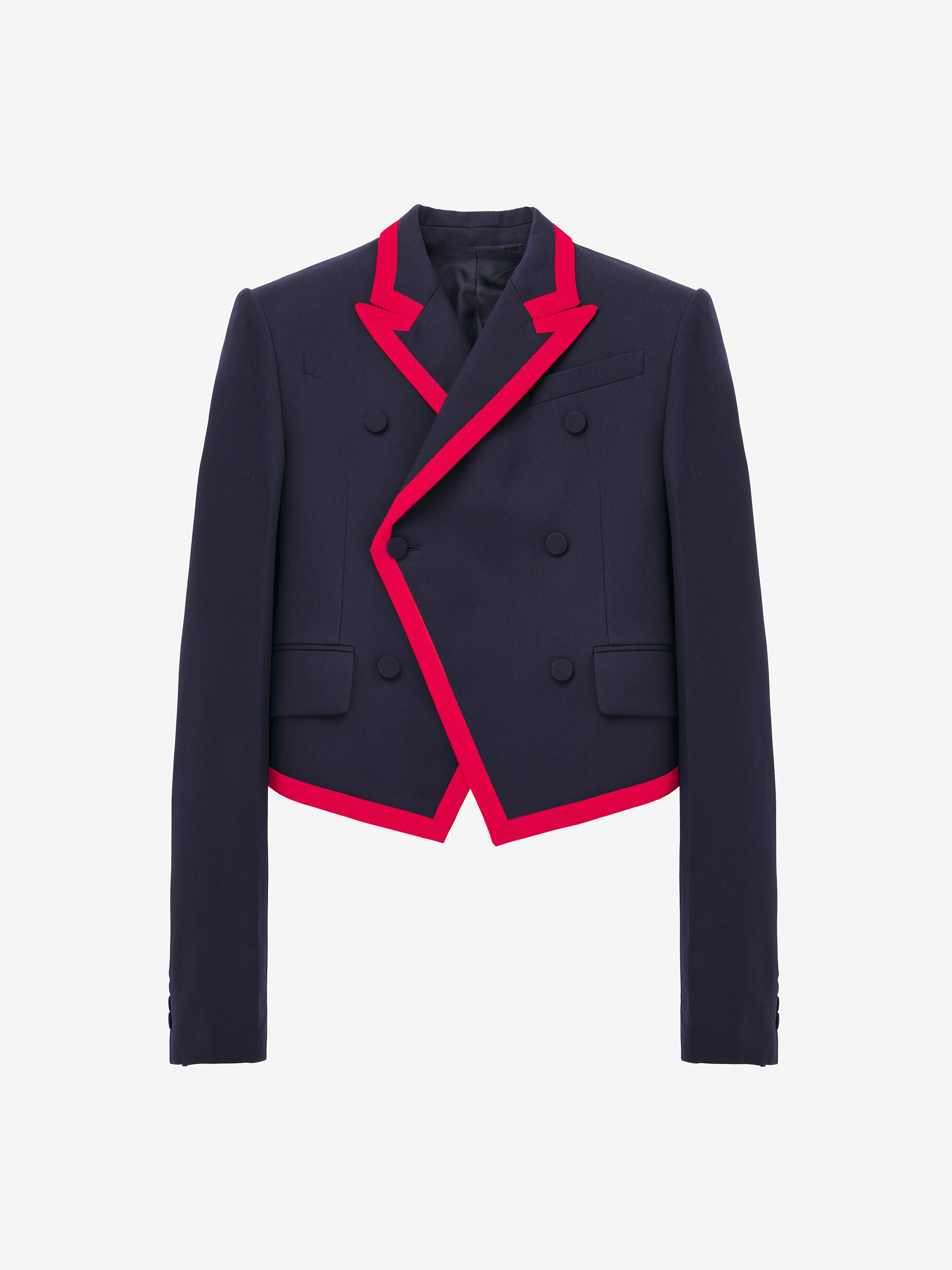 Double-breasted shrunken blazer in navy blue wool gabardine with red binding. Peak lapels, chest pocket and two side flap pockets. Finished with a T-Bar chain back detail. Product details - Peak lapels - Chest pocket - Button fastening - Made with certified wool yarn - Product code: 830934QUAAC4100 - Made in Italy - Material: 100% Wool