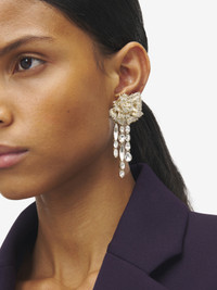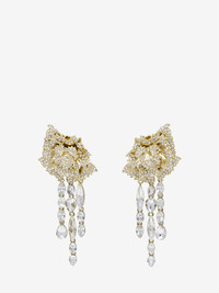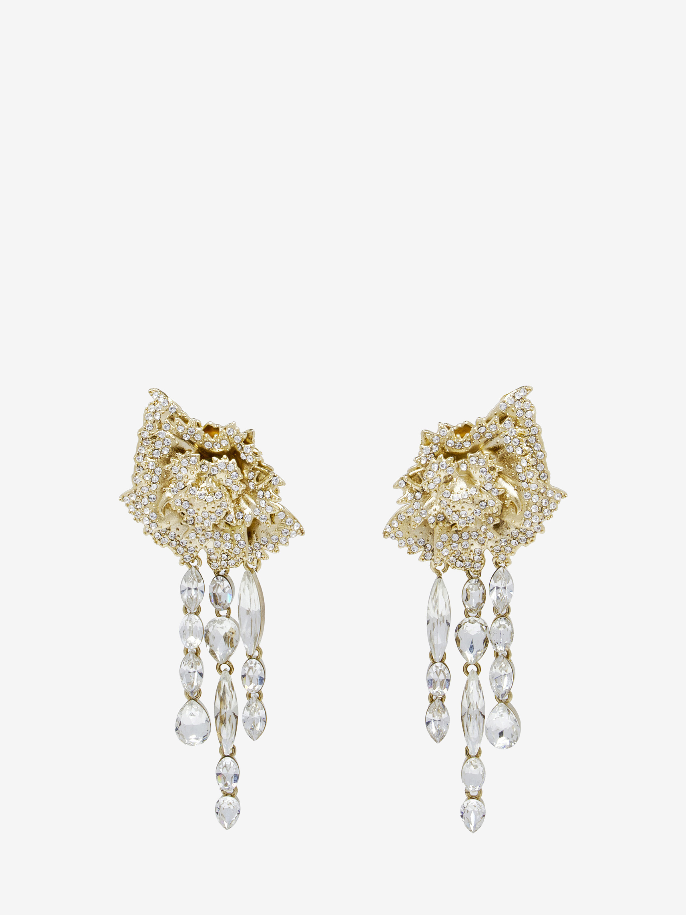 Pale gold-finished Carnation pendant earrings embellished with multisize clear crystals. Brass hardware engraved with the McQueen logo on the back. Suitable for pierced ears. Product details - Height: 10.85cm / 4.2 inches - Brass hardware - Pale gold finish - Suitable for pierced ears - Push-back closure - For hygiene reasons, we do not accept returns or exchanges on all pierced earrings. - Product code: 846511J161C1035 - Made in ITALY - Material: Brass