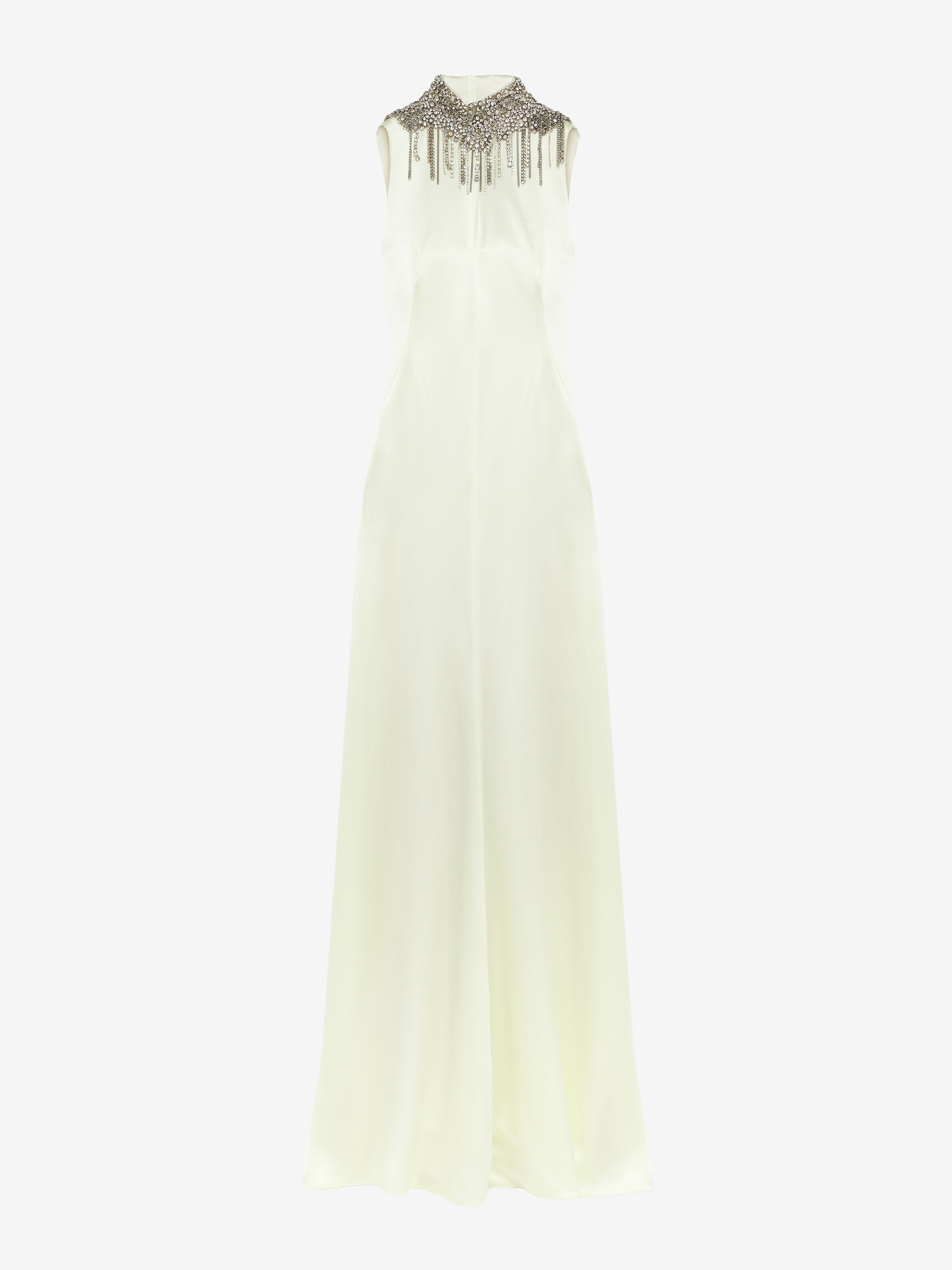 Evening dress in gesso hammered satin. High neck with Chain Mail embroidery made with crystals, bugle beads, metal bullion and dangling details. Finished with an open back with neck button fastening. Product details - Embellished high neck - Back button fastening - Product code: 854343QEAHL9311 - Made in ITALY - Material: 51% Acetate, 49% Viscose