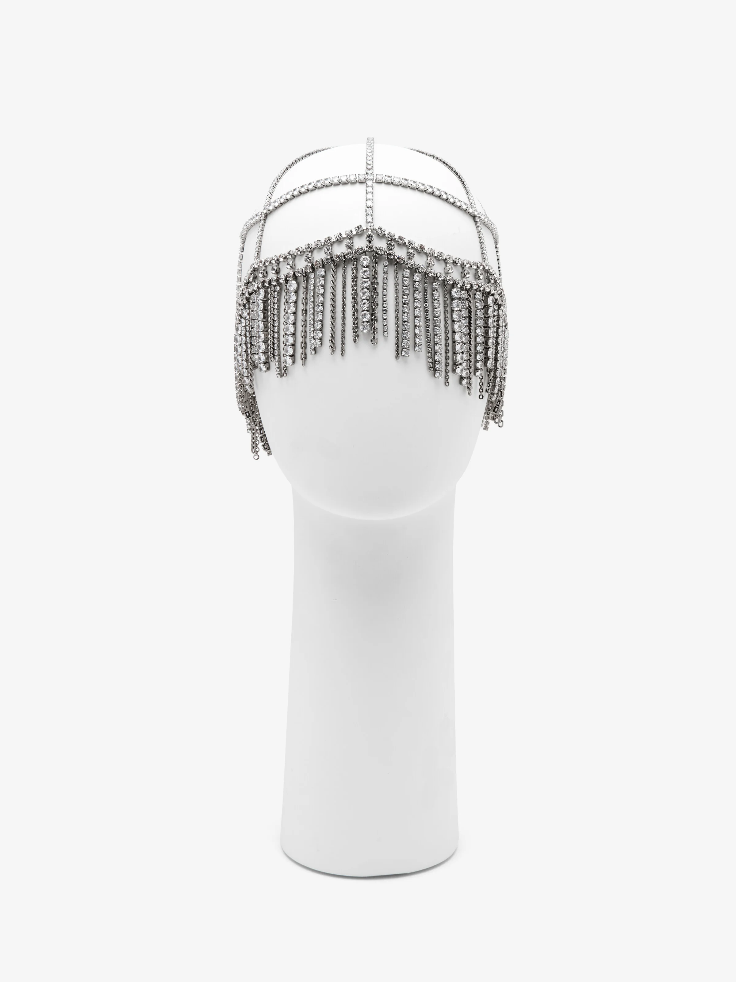 Light antique silver-finished head piece embellished with clear crystal chains. McQueen logo engraving. Lobster clasp closure. Adjustable length. Product details - Brass hardware - Antique silver finish - Lobster clasp closure - Adjustable length - Product code: 859711J161Z1021 - Made in ITALY - Material: Brass