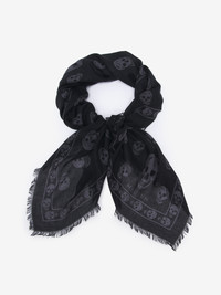 Black and dark grey modal and silk blend foulard featuring an all-over skull motif. The foulard is detailed with a skull border and the McQueen logo. Finished with frayed edges. Product details - Dimensions: 104 x 120cm / 40.9 x 47.2 inches - Product code: 8078894943Q1061 - Made in ITALY - Material: 85% Modal , 15% Silk