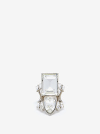 Palladium-finished ring featuring large clear crystals with pear and emerald cuts. Brass hardware with McQueen logo engraving on the back. Product details - Height: 3.7cm / 1.4 inches - Brass hardware - Palladium finish - Available in three sizes - Product code: 846560J161B1021 - Made in ITALY - Material: 100% Brass