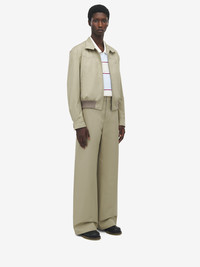 Cropped Harrington jacket. Beige cotton gabardine with tonal McQueen logo embroidery. Side pockets and ribbed trims. Finished with a two-button collar and front zip fastening. Product details - Two-button collar - Side pockets - Front zip fastening - Made with organic cotton yarn - Product code: 827425QSABY2001 - Made in Italy - Material: Cotton