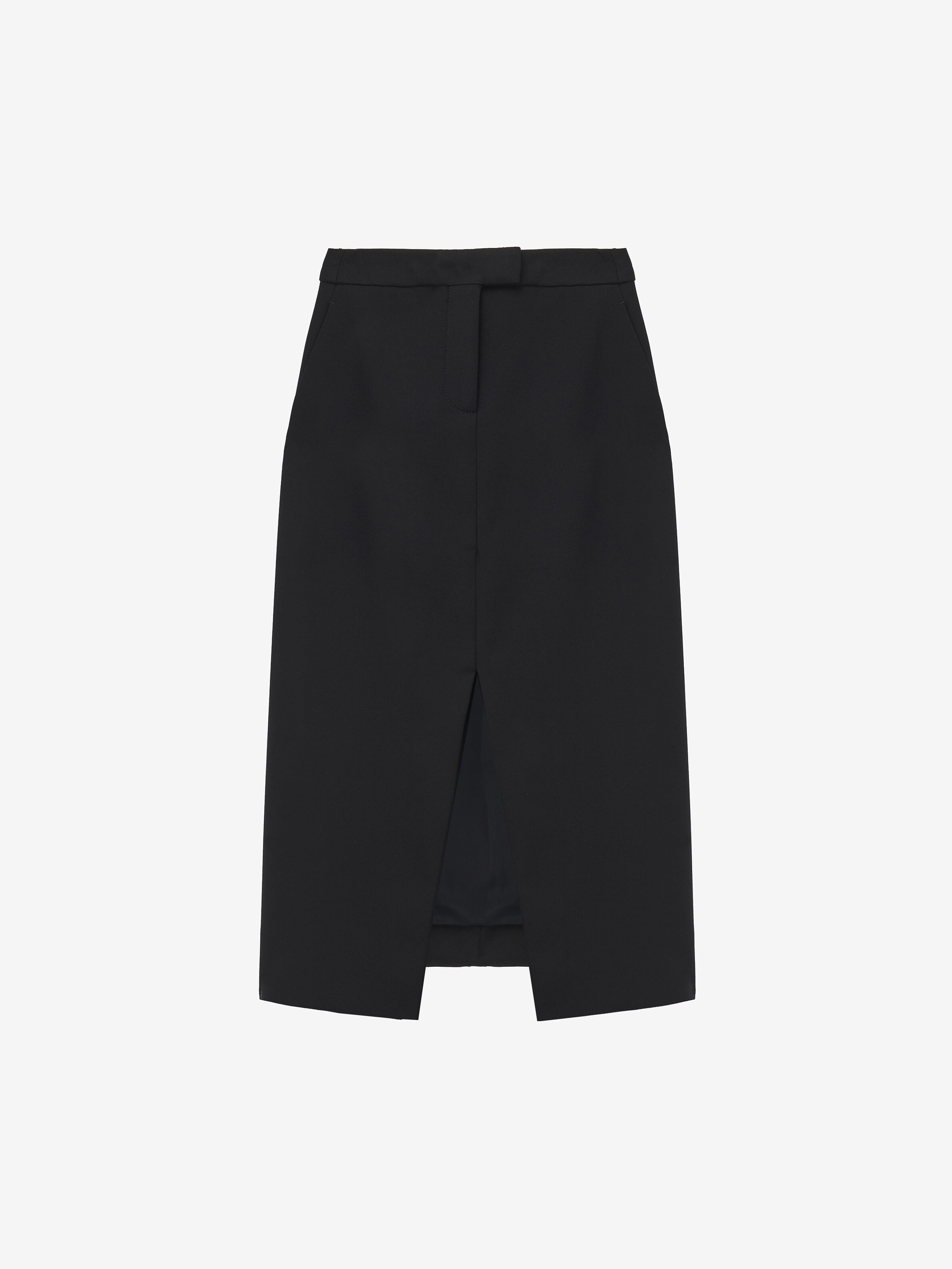 Cutaway pencil skirt in black stretch wool gabardine. Belt loops, side pockets and kickback silhouette. Finished with a concealed zip and hook fastening. Product details - Belt loops - Side pockets - Concealed zip and hook fastening - Product code: 848863QJAFK1000 - Made in ITALY - Material: 98% Wool, 2% Elastane