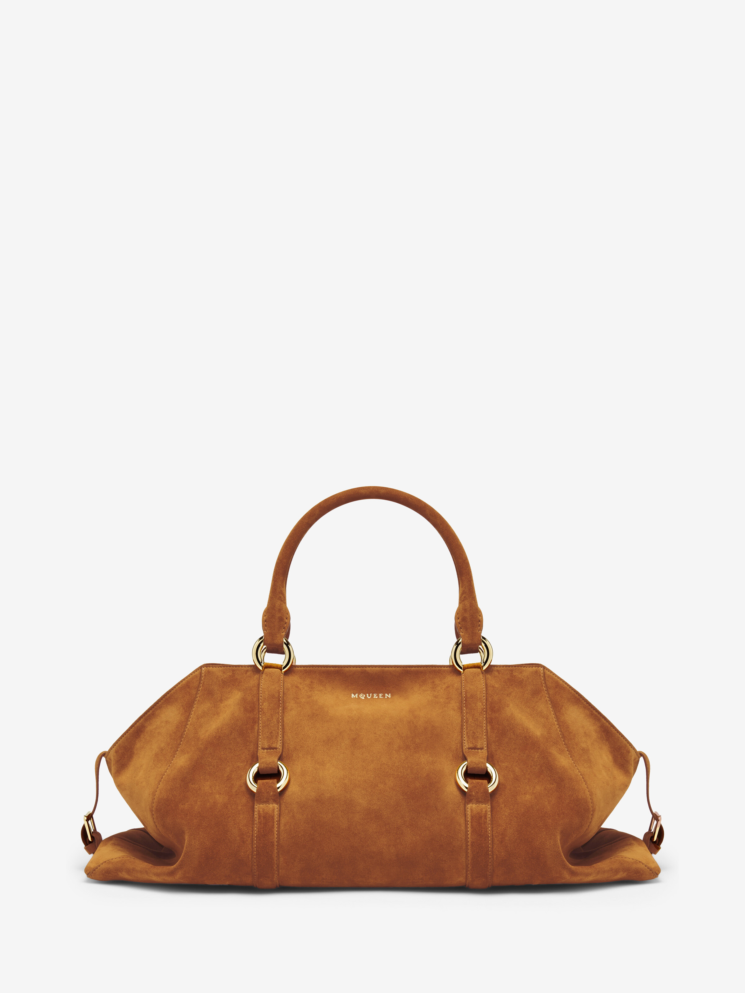 The Farringdon Bag – named after the historic London neighborhood where McQueen's HQ is located. Elongated silhouette crafted from tan suede leather with gold metal hardware and leather belt detailing inspired from McQueen's iconic harness belts. The side buckled straps allow to adjust the bag's capacity. This bag can be worn in multiple ways handheld using the tubular handles or over the shoulder using the detachable leather strap. Product details - Dimensions: Length 44 x Height 20-25 x Depth 12 cm / 17.3 x 7.8-9.8 x 4.7 inches - Adjustable side straps - McQueen logo embossed foil on the front quadrant - Zip fastening - One main compartment with flat leather pocket - Round metal rings with shiny gold finishing - Organic cotton canvas lining - Removable leather handle cover to protect the suede handles - Product code: 8456441MAA52150 - Made in ITALY - Material: 100% Calf Leather