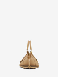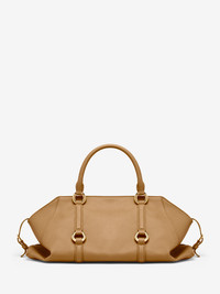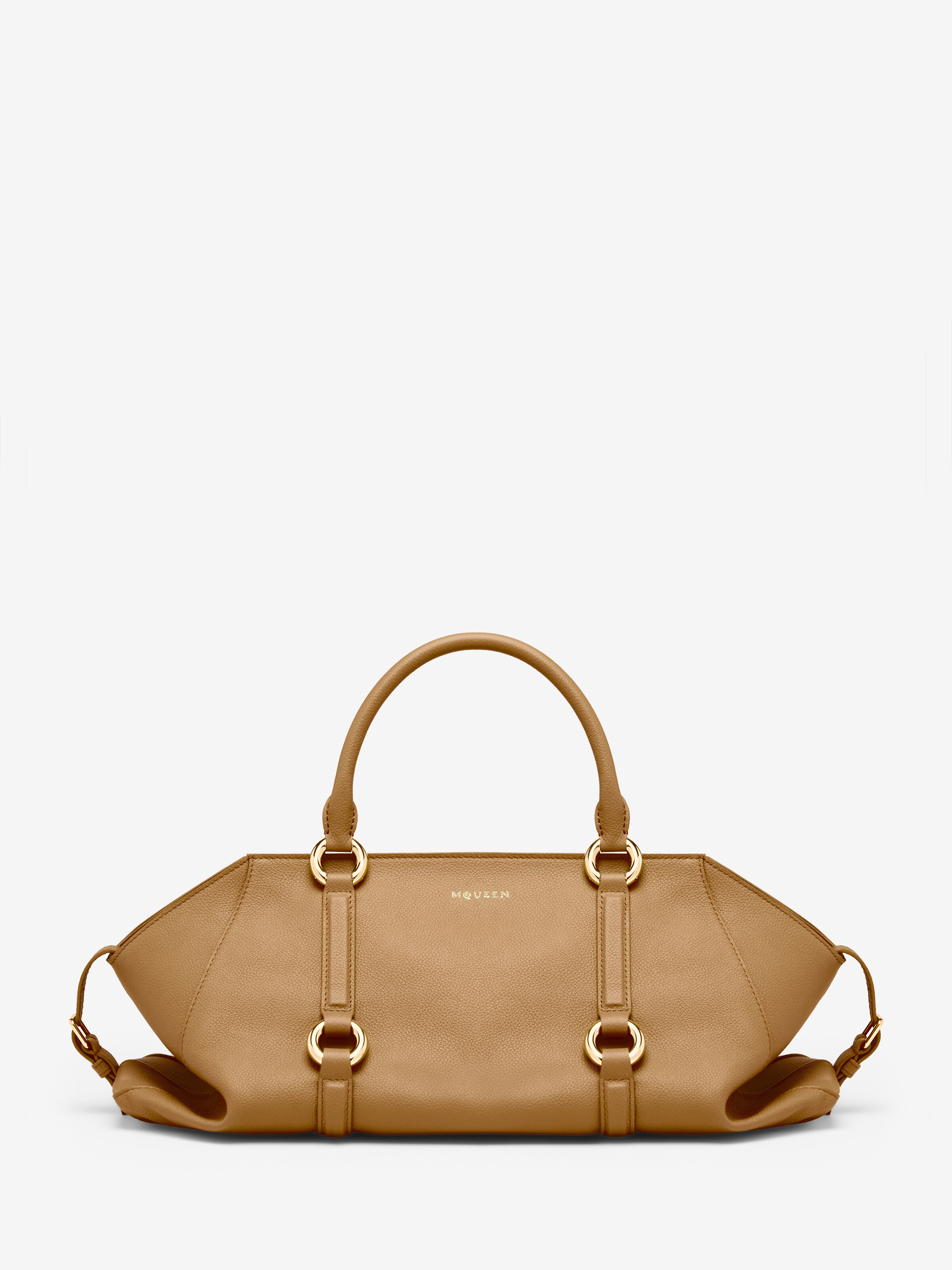 The Farringdon Bag – named after the historic London neighborhood where McQueen's HQ is located. Elongated silhouette crafted from sand grainy calf leather with gold metal hardware and leather belt detailing inspired from McQueen's iconic harness belts. The side buckled straps allow to adjust the bag's capacity. This bag can be worn in multiple ways: handheld using the tubular handles or over the shoulder using the detachable leather strap. Product details - Dimensions: Length 44 x Height 20-25 x Depth 12 cm / 17.3 x 7.8-9.8 x 4.7 inches - Adjustable side straps - McQueen logo embossed foil on the front quadrant - Zip fastening - One main compartment with flat leather pocket - Round metal rings with shiny gold finishing - Organic cotton canvas lining - Product code: 8456441VDEB9810 - Made in ITALY - Material: 100% Calf Leather