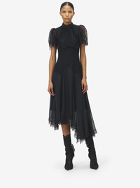 Victorian-inspired asymmetric evening dress in black chiffon and floral lace. High neck, short sleeves and corset detailing. Finished with a back zip fastening. Product details - High neck - Short sleeves - Back zip fastening - Product code: 843633QZAPW1000 - Made in ITALY - Material: 61% Polyamide, 39% Viscose