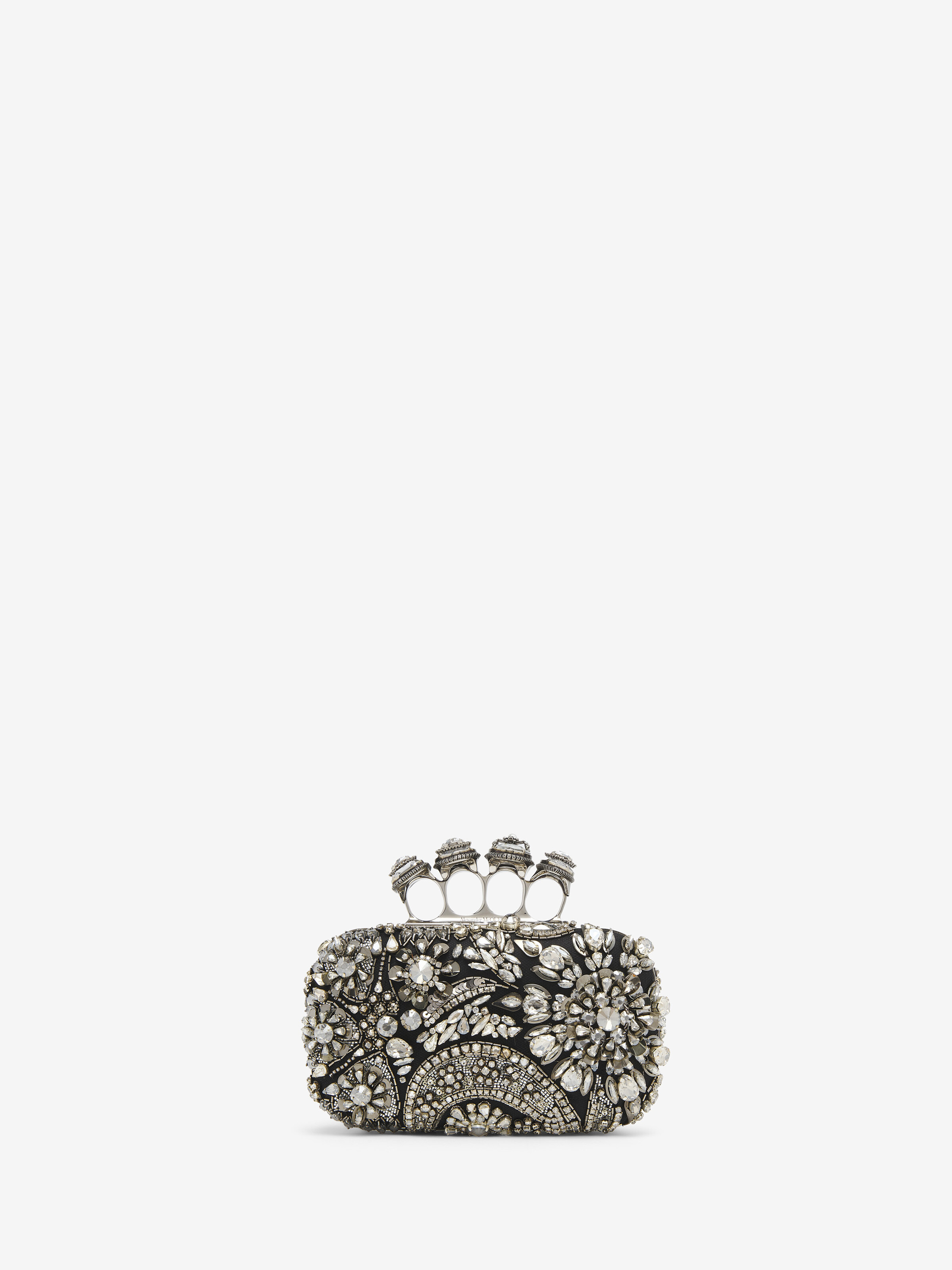 The Jewelled Spider Knuckle Clutch – handcrafted with multicolour faceted stone and bead embroidery on a black satin base. Finished with gold-tone metal rings. Each ring is cut to a different shape and completed with a faceted stone, with one ring bearing an intricate spider motif. Can be worn handheld or on the shoulder with the removable chain strap. Product details - Dimensions: 10 x 18 x 5 cm / 3.9 x 7 x 1.9 inches - Strap drop: 55cm / 21.6 inches - Silver-finished handle adorned with crystal-encrusted rings - Detachable chain strap - Black suede leather lining - Brass hardware with antique silver finishing - Due to the appearance of the product, we recommend stowing it in your hold luggage when passing through airport security. For the same reason we recommend not taking the bag to public places, such as law courts and sports stadiums, where there may be security checks. - Product code: 835584KR7821485 - Made in Italy - Material: 72% Viscose, 28% Silk