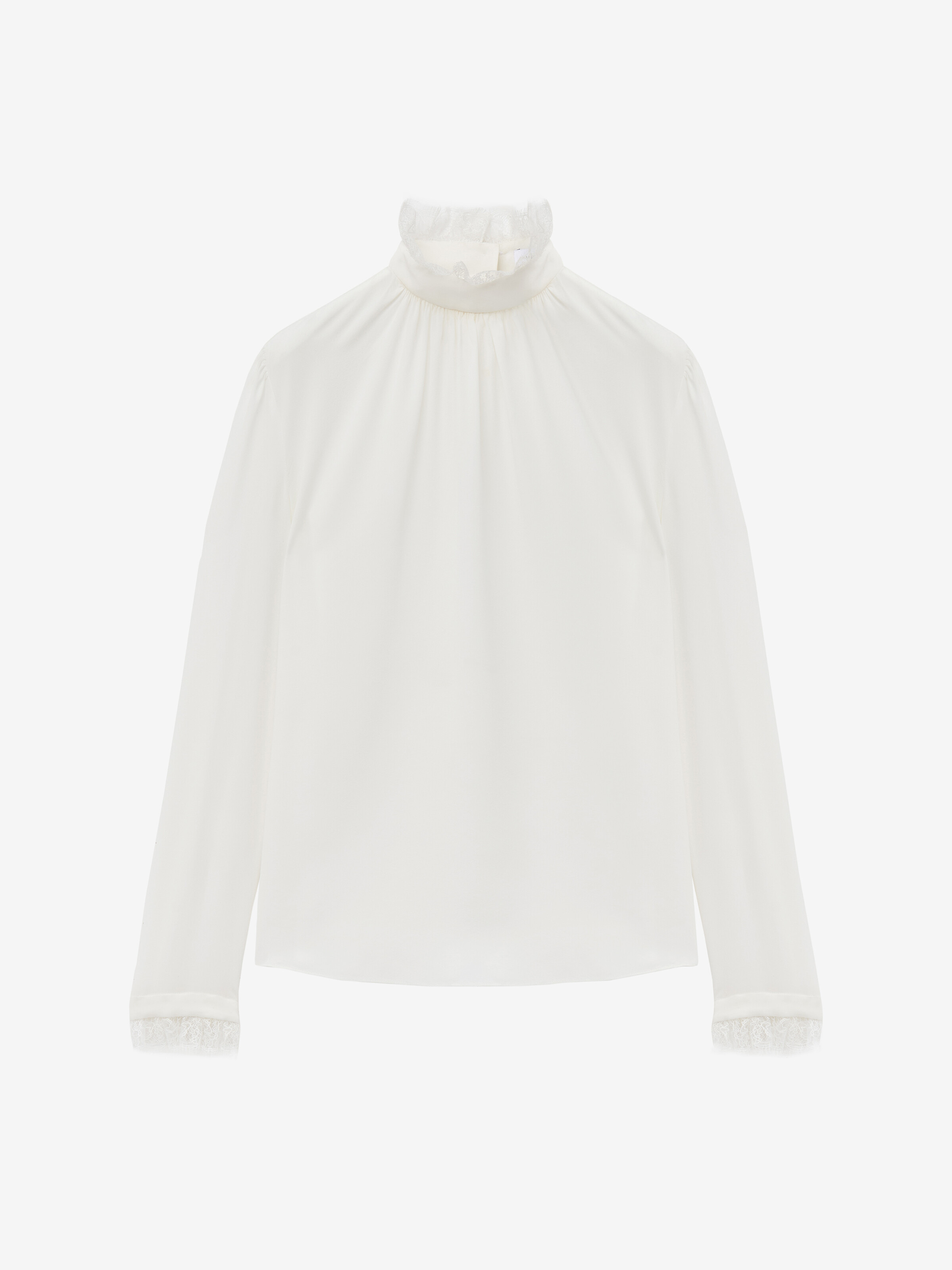 Long-sleeved top in light ivory crepe de chine. Stand collar with gathered detailing on the chest and tonal lace panels at the neck and cuffs. Finished with a button-fastening keyhole at the back. Product details - Standing collar - Long sleeves - Button-fastening keyhole - Product code: 848907QBADT9007 - Made in ITALY - Material: 100% Silk