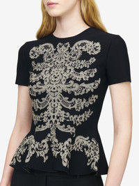 Black peplum top with contrasting Lace Ribcage jacquard on the front. Crew neck and short sleeves. Finished with a back zip fastening. Product details - Crew neck - Short sleeves - Back zip fastening - Product code: 852789Q1BFU1062 - Made in ITALY - Material: 84% Viscose, 14% Polyster, 2% Metalic Polyester