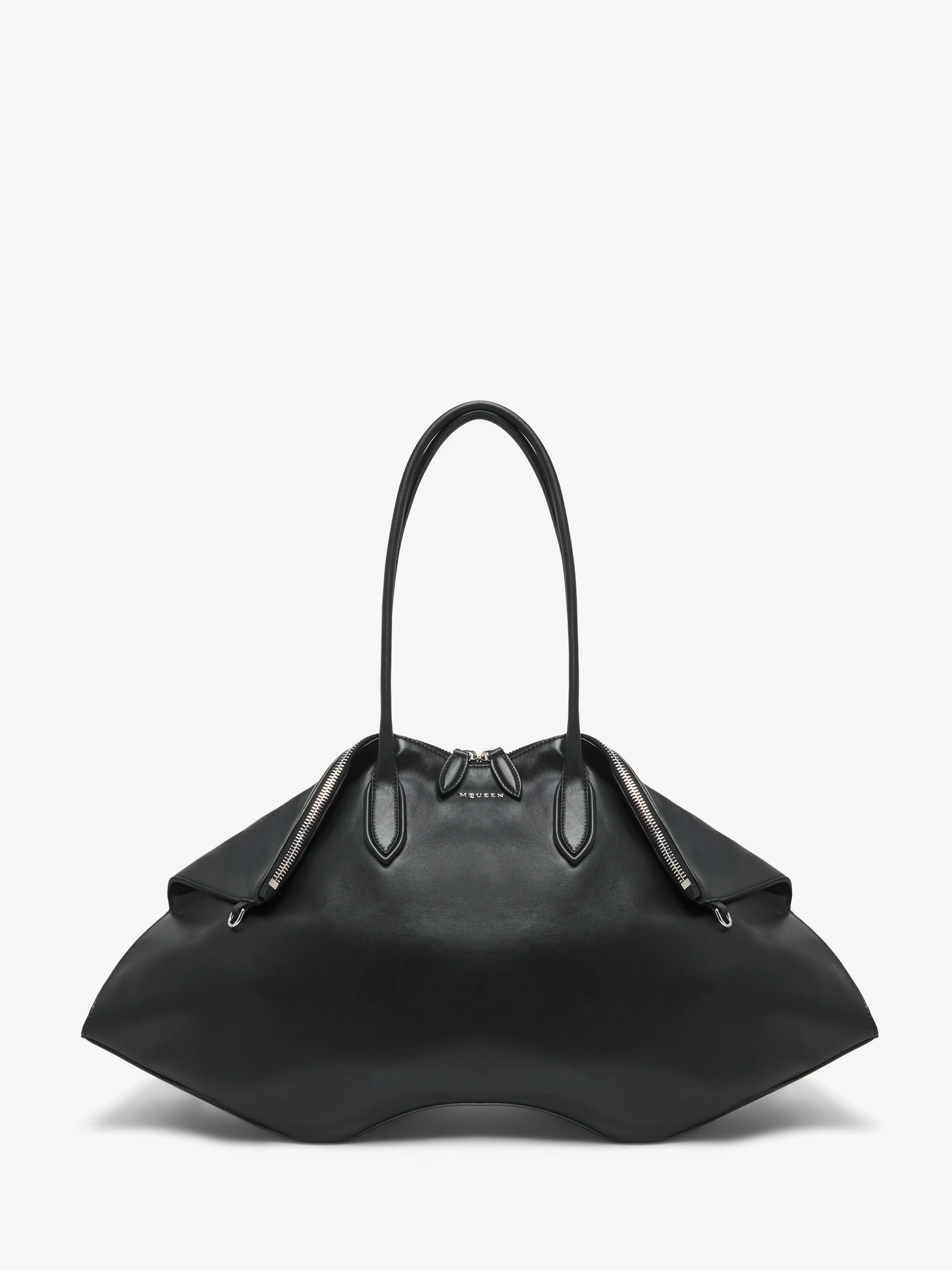The Maxi Manta Bag – a reinterpretation of an iconic archival silhouette in black nappa calf leather. Made in a sculptural construction with folded upper edges and a rigid wave-shaped base. Detailed with a high-frequency McQueen foiled logo on the front. This statement oversized bag can be carried hand-held or worn over the shoulder using the long tubular handles. Product details - Dimensions: Length 59 cm x Height 25.5 cm x Depth 17cm - Long tubular handles - High-frequency McQueen foiled logo on the front - Zip fastening with hidden magnets - Metal D-ring in the top left corner - Internal zip pocket - Brass hardware with silver finishing - Canvas lining - Product code: 8559961VDXA1000 - Made in ITALY - Material: Calf Leather