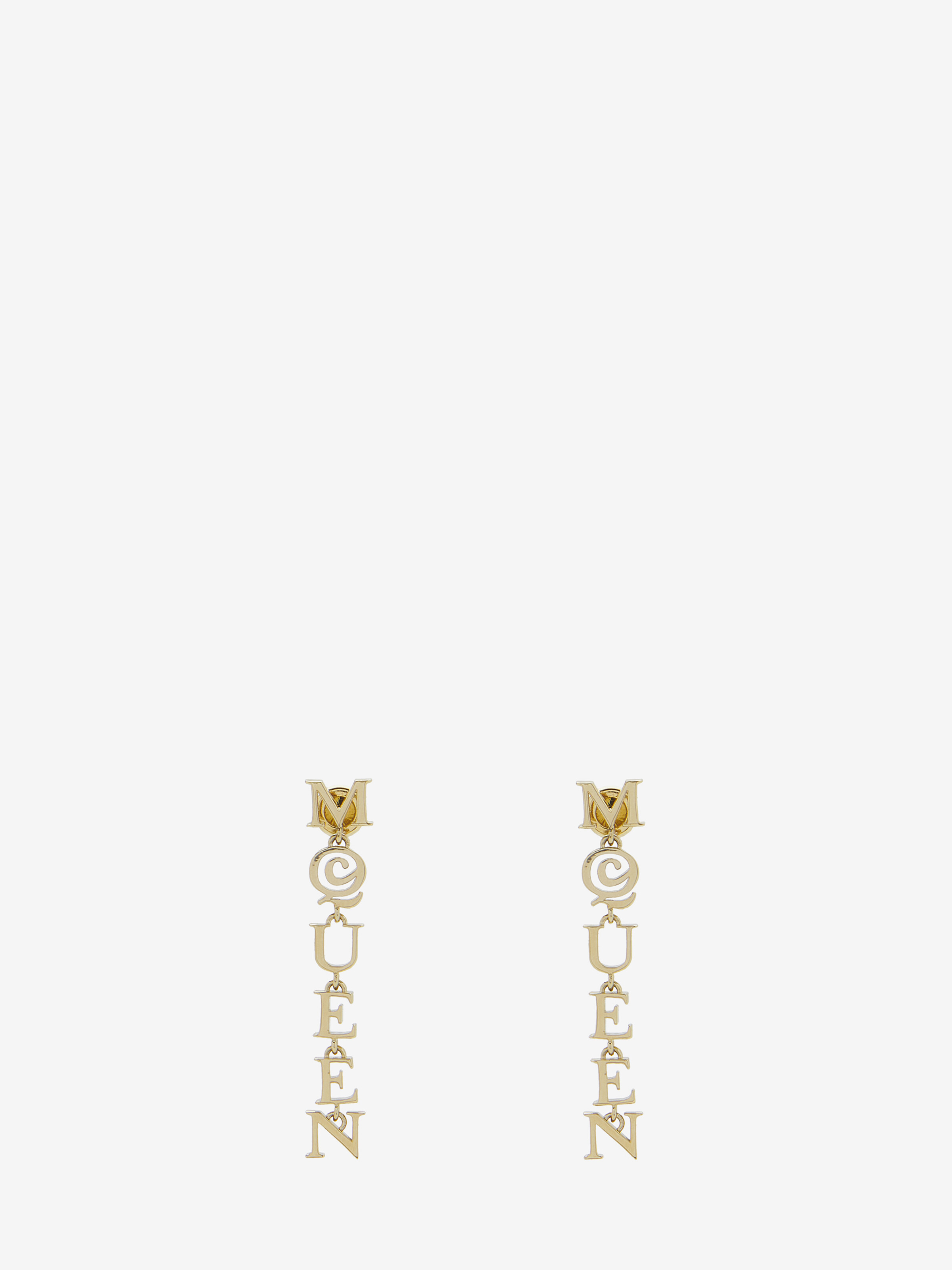 Pale gold-finished earrings featuring a McQueen logo pendant. Eco-brass hardware. Suitable for pierced ears. Product details - Height: 0.65 cm / 0.2 inches - Eco-brass hardware - Pale gold finish - Suitable for pierced ears - Push-back closure - For hygiene reasons, we do not accept returns or exchanges on any pierced earrings. - Product code: 836403J161G0953 - Made in Italy - Material: Brass