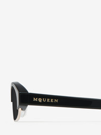 Black acetate sunglasses fitted with solid smoke lenses. The sunglasses feature a narrow oval shape with a half-rim construction and adjustable nose pads. The temples are detailed with a lasered McQueen logo. All McQueen Eyewear is 100% certified UV protective (UVA and UVB rays). Product details - The Eastman Acetate Renew used in this style includes 27% recycled material achieved via mass balance approach. - The style can be fitted with prescription lenses. - Product code: 841557J07491056 - Made in JAPAN - Material: Recycle Acetate & Bio Nylon Lens