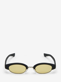 Matte black acetate sunglasses fitted with solid yellow lenses. The sunglasses feature a narrow oval shape with a half-rim construction and adjustable nose pads. The temples are detailed with a lasered McQueen logo. All McQueen Eyewear is 100% certified UV protective (UVA and UVB rays). Product details - The Eastman Acetate Renew used in this style includes 27% recycled material achieved via mass balance approach. - The style can be fitted with prescription lenses. - Product code: 841557J07491025 - Made in JAPAN - Material: Recycle Acetate & Bio Nylon Lens