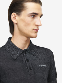 Polo shirt in black wool piquet with metallic yarn detailing. Point collar and contrast McQueen logo embroidery on the chest. Finished with ribbed trims. Product details - Point collar - Short sleeves - Product code: 852996Q1BFV1038 - Made in ITALY - Material: 91% Wool, 6% Polyester, 2% Metalic Polyester