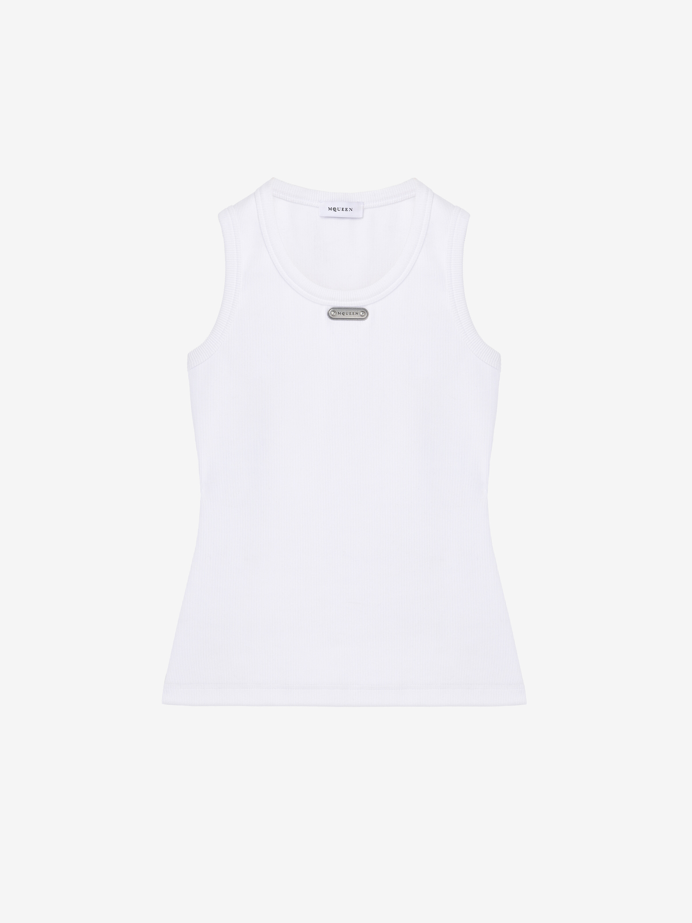 Tank top in optical white cotton rib. Crew neck and silver metal placket with the engraved McQueen logo. Product details - Crew neck - Made with organic cotton yarn - Product code: 839507QLAER9000 - Made in Italy - Material: 98% Cotton, 2% Elastane