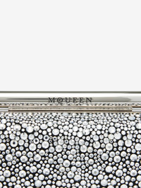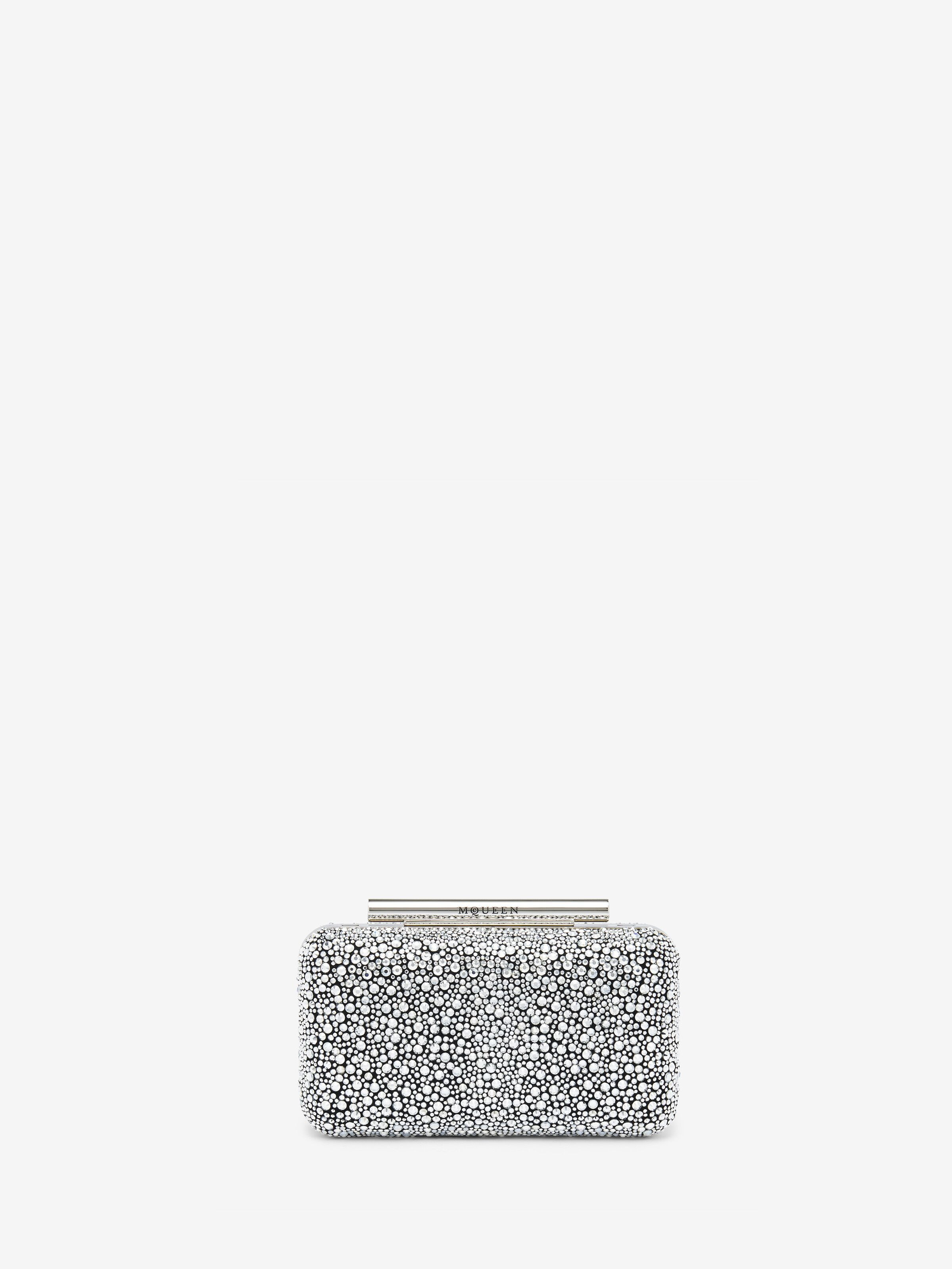The McQueen T-Bar box clutch – black suede calf leather embellished with silver round strass and studs. Silver tone T-Bar clasp closure engraved with the McQueen logo. Can be worn handheld or on the shoulder with the removable chain strap. Product details - Dimensions: Length 19 x Height 10 x Depth 4.5cm / 7.4 x 3.9 x 1.7 inches - Strap drop: 53cm / 20.8 inches - T-Bar clasp closure with McQueen logo - One main compartment - Extractable metal hooks for detachable chain strap - Brass hardware with silver tone - Black suede calf leather lining - Product code: 8137151BLOQ1000 - Made in Italy - Material: Calf Leather