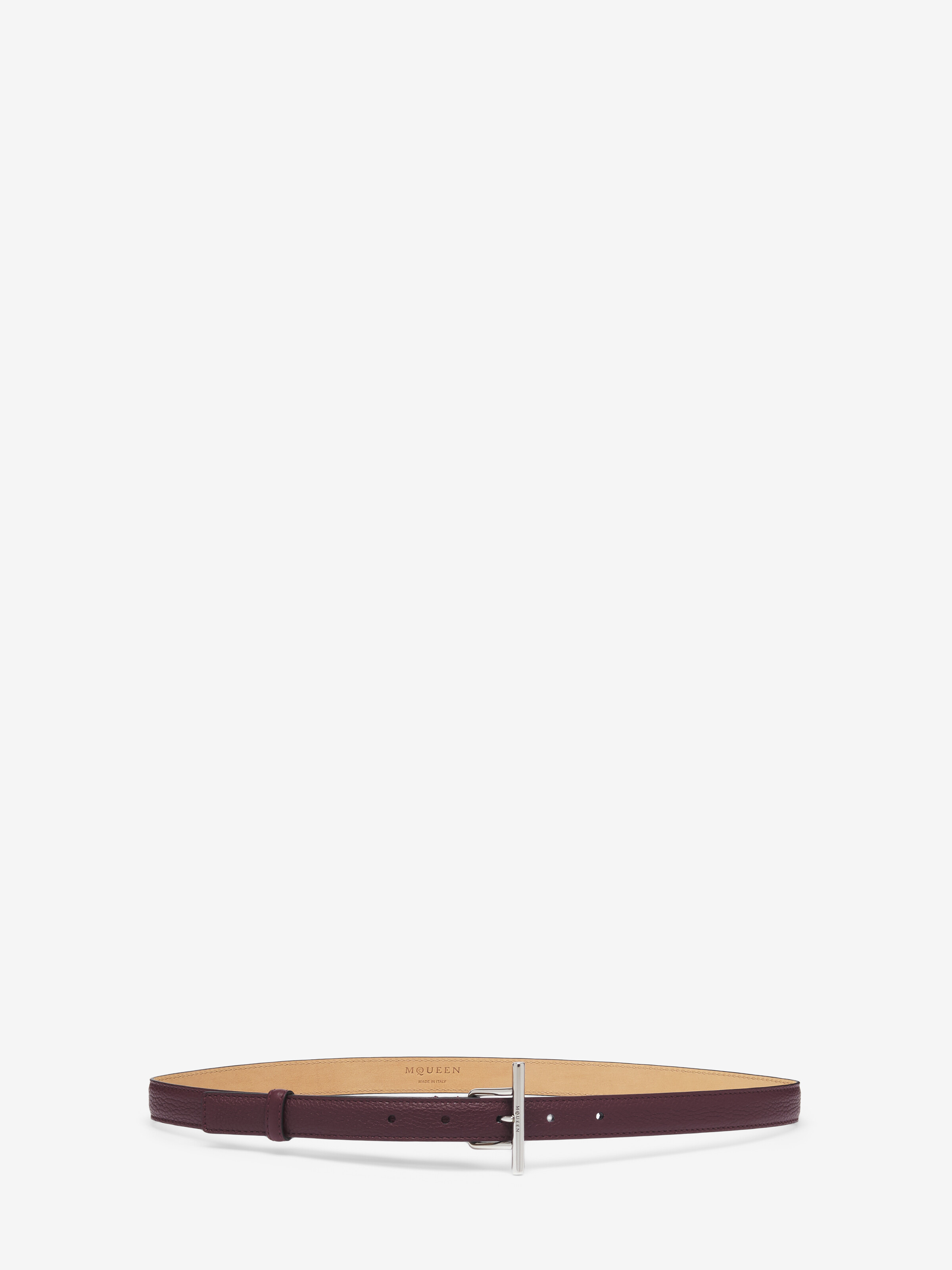The McQueen T-Bar Hip belt – grainy oxblood calf leather. Finished with a statement T-Bar buckle in silver tone metal engraved with the McQueen logo. Product details - Width: 20mm / 0.7 inches - T-Bar buckle: 50mm / 1.9 inches - Brass hardware with silver tone - Product code: 8153011HB776408 - Made in Italy - Material: Calf Leather