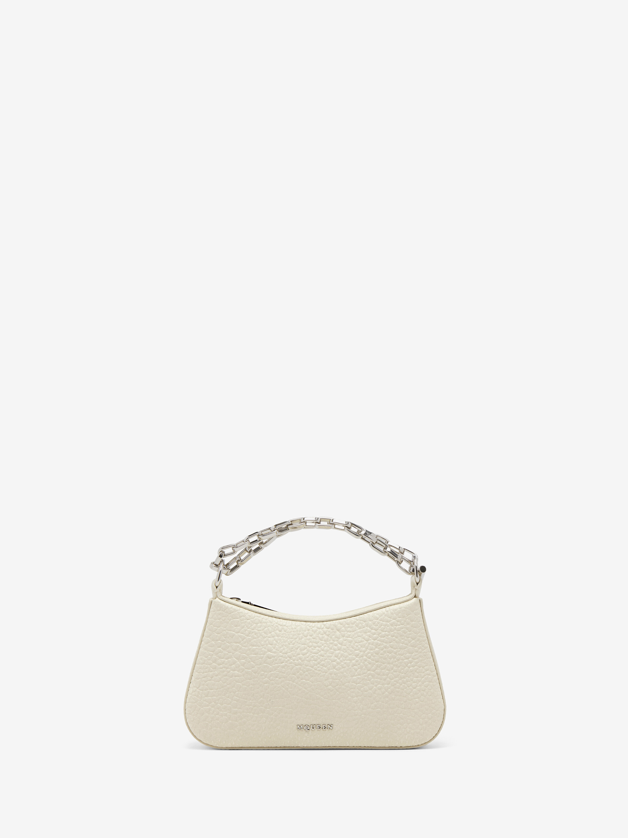 The McQueen T-Bar Pouch – elegant curved body in cream lamb leather characterized by a peculiar irregular grain. A silver tone metal chain strap ending with a signature T-Bar hook engraved with the McQueen logo. Can be carried on the shoulder or in the crook of the arm by doubling up the chain strap. Product details - Dimensions: Length 21 x Height 12 x Depth 3.5 cm / 8.2 x 4.7 x 1.3 inches - Chain strap can be worn single or doubled up - Zip fastening - Silver tone hardware - One central compartment - Internal card slot - Tonal nappa leather lining - Can accommodate a smartphone - Product code: 8135531VDGB9701 - Made in Italy - Material: Lambskin