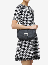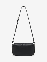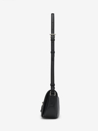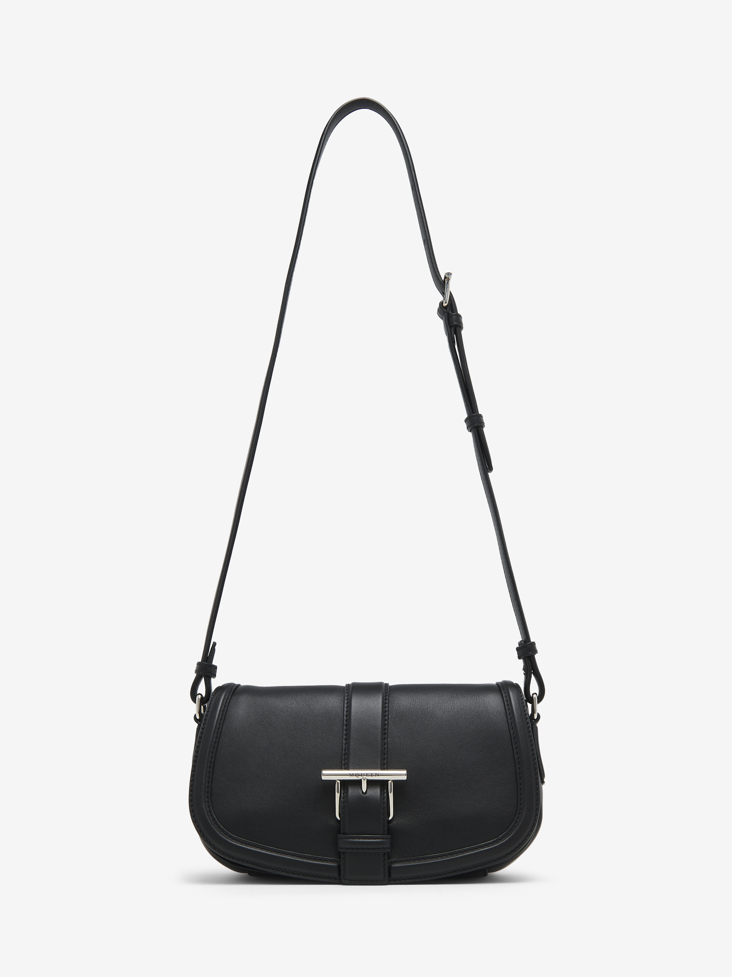 The McQueen T-Bar Satchel – sleek silhouette crafted from black smooth calf leather with bombe leather frames. Antique silver-finished T-Bar on the front leather belt engraved with the McQueen logo. Can be carried on the shoulder or crossbody with the detachable straps. Product details - Dimensions: Length 27 x Height 16 x Depth 7 cm / 10.6 x 6.2 x 2.7 inches - Max strap drop: 55cm / 21.6 inches - Silver-finished T-Bar on the front belt - One central compartment and one open back pocket - Internal zip pocket - 1 detachable and adjustable crossbody - strap + 1 detachable non-adjustable shoulder strap - Magnet fastening - Brass hardware with antique silver finishing - Black canvas lining - Product code: 8271111MAAD1000 - Made in Italy - Material: 100% Calf Leather