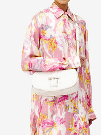 The McQueen T-Bar Satchel – sleek silhouette crafted from ivory smooth calf leather with bombe leather frames. Antique silver-finished T-Bar on the front leather belt engraved with the McQueen logo. Can be carried on the shoulder or crossbody with the detachable straps. Product details - Dimensions: Length 27 x Height 16 x Depth 7 cm / 10.6 x 6.2 x 2.7 inches - Max strap drop: 55cm / 21.6 inches - Silver-finished T-Bar on the front belt - One central compartment and one open back pocket - Internal zip pocket - 1 detachable and adjustable crossbody - strap + 1 detachable non-adjustable shoulder strap - Magnet fastening - Brass hardware with antique silver finishing - Canvas lining - Product code: 8271111MAAD9002 - Made in Italy - Material: 100% Calf Leather