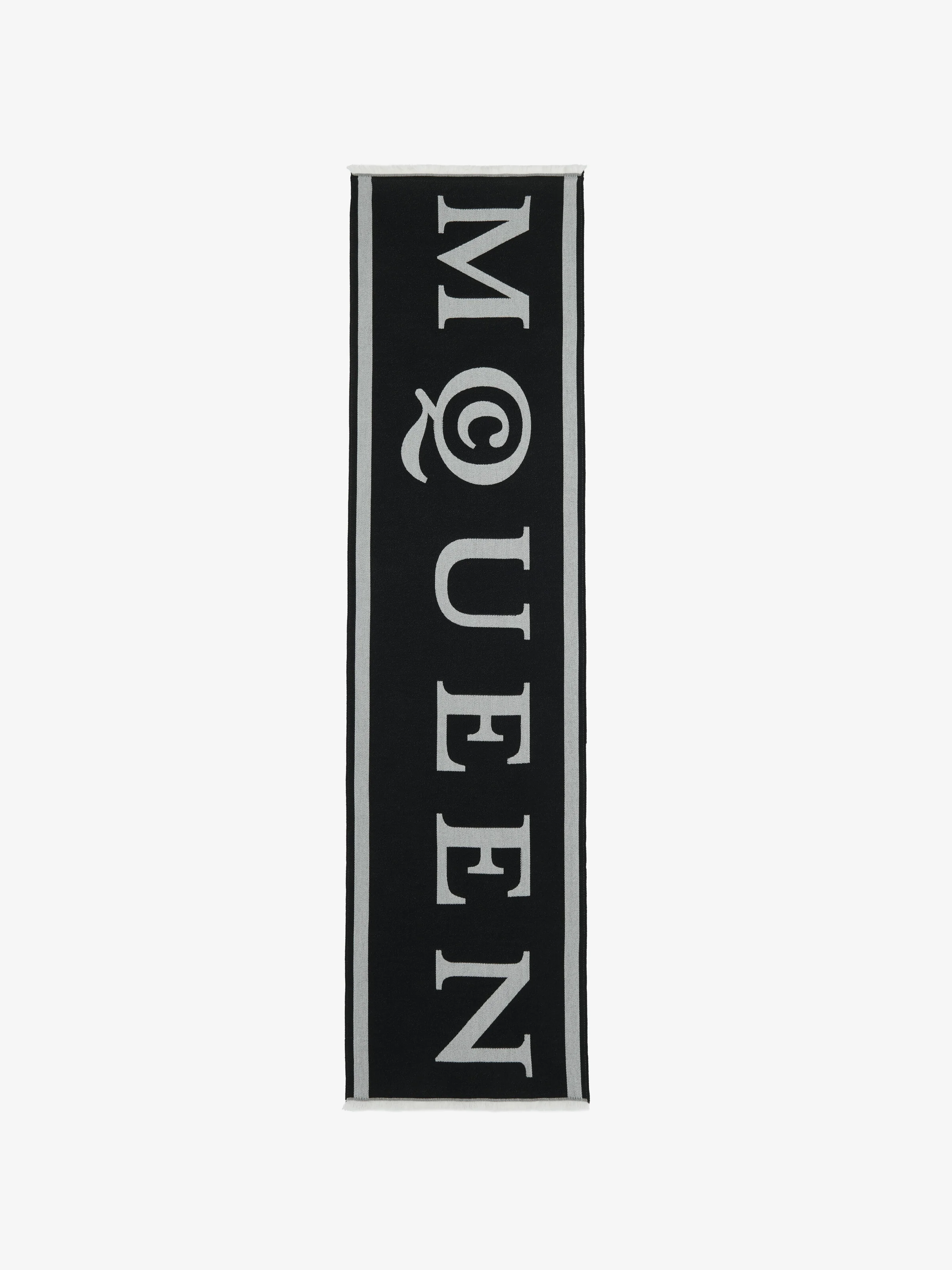 Black and ivory wool jacquard scarf featuring an exploded McQueen logo. The scarf is finished with frayed edges. Product details - Dimensions: 50 x 190cm / 19.6 x 74.8 inches - Product code: 8566993200Q1078 - Made in ITALY - Material: 100% Wool
