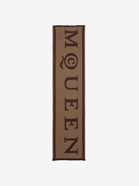 Camel and bordeaux wool jacquard scarf featuring an exploded McQueen logo. The scarf is finished with frayed edges. Product details - Dimensions: 50 x 190cm / 19.6 x 74.8 inches - Product code: 8566993200Q9873 - Made in ITALY - Material: 100% Wool