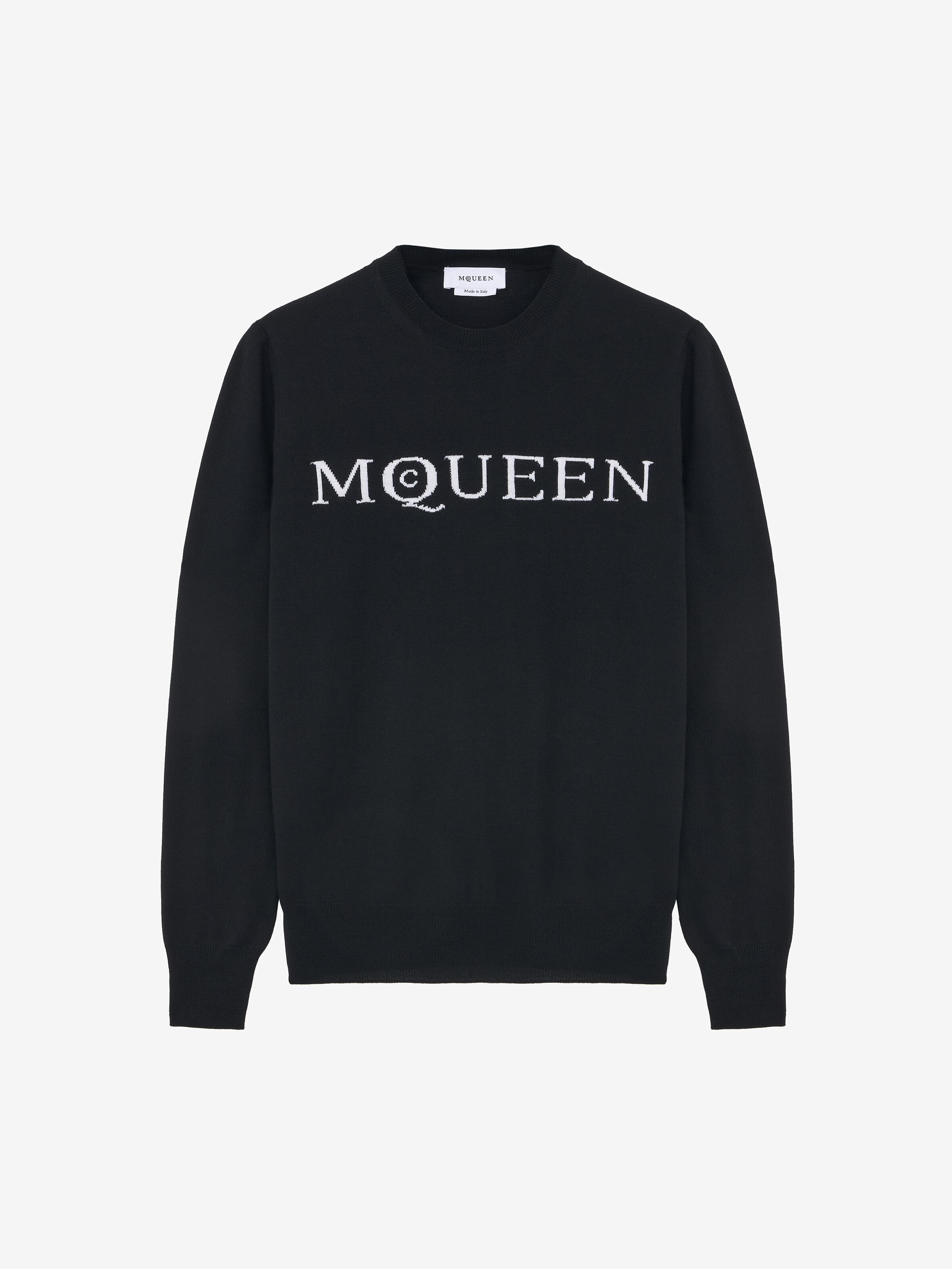 Crew neck jumper. Black fine merino wool with ivory McQueen logo intarsia on the chest. Finished with tonal ribbed trims. Product details - Crew neck - Long sleeves - Ribbed trims - Product code: 839681Q1BEB1218 - Made in Italy - Material: 100% Wool