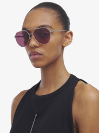 Silver metal sunglasses featuring a pilot construction with solid burgundy lenses. The sunglasses are detailed with tonal metal plaques on the temples and a lasered McQueen logo. All Alexander McQueen Eyewear is 100% certified UV protective (UVA and UVB rays). This frame can be fitted with prescription lenses. Product details - Product code: 810719I33301280 - Made in Japan - Material: Metal
