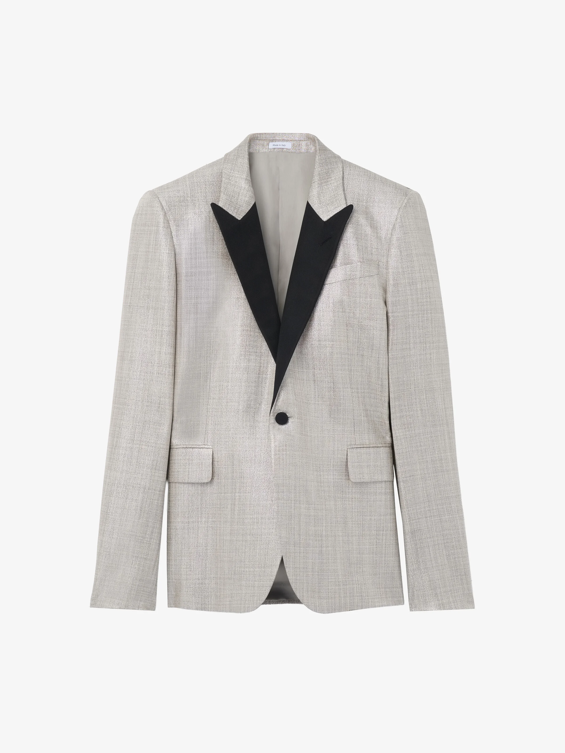 Single-breasted jacket in pale gold metallic tailoring. Contrast black satin peak lapels, chest pocket and two flap pockets on the sides. Finished with a single button fastening. Product details - Peak lapels - Side flap pockets - Single button fastening - Product code: 851324QRACV7082 - Made in ITALY - Material: 83% Viscose, 17% Metalic Polyester