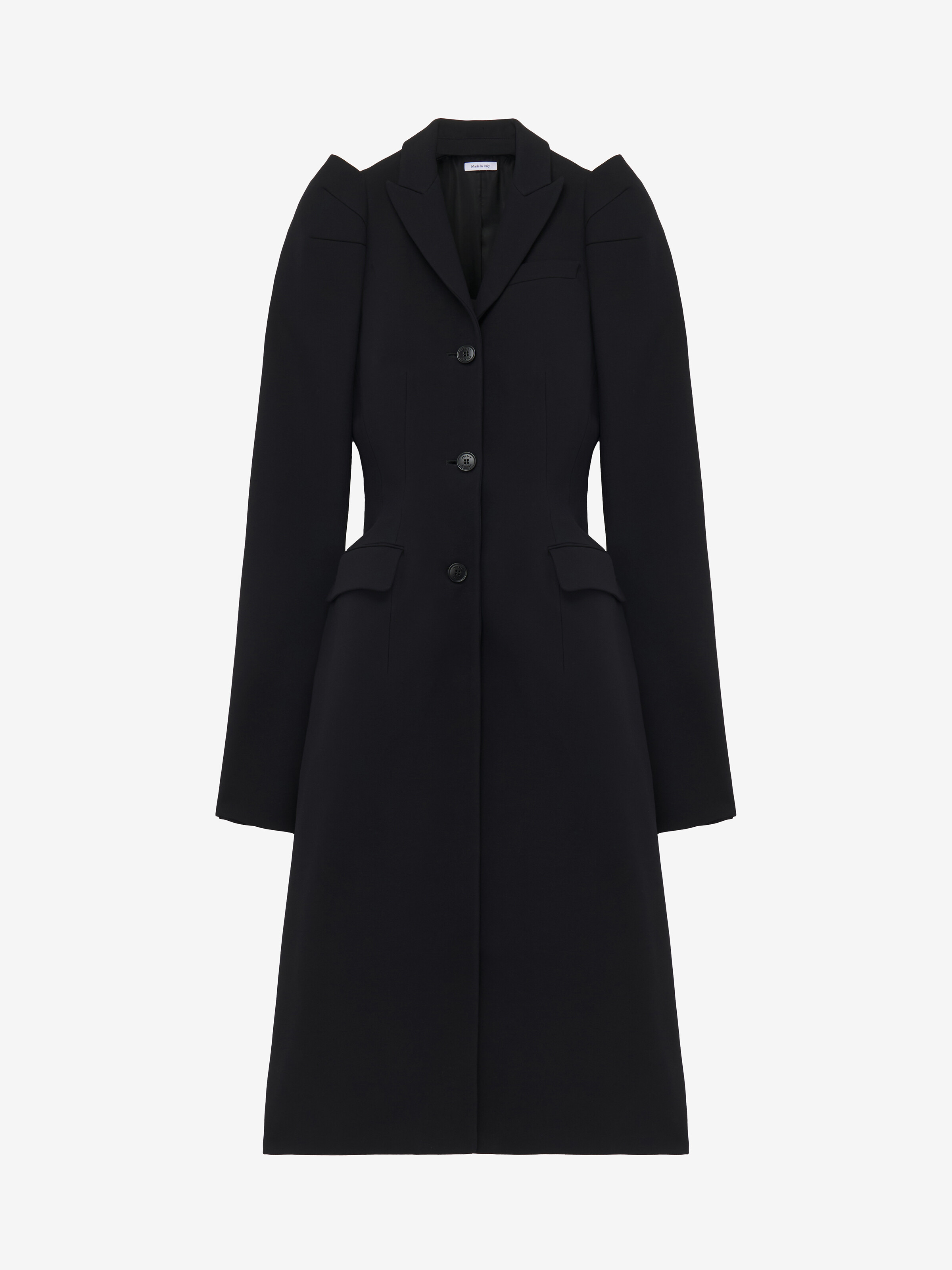 shoulder single-breasted coat in black light wool silk. Peak lapels, side flap pockets and bombe hips. Finished with a T-Bar chain back detail. Product details - Peak lapels - Side flap pockets - Button fastening - Product code: 842823QJAAA1000 - Made in ITALY - Material: 63% Wool, 25% Silk, 12% Polyamide