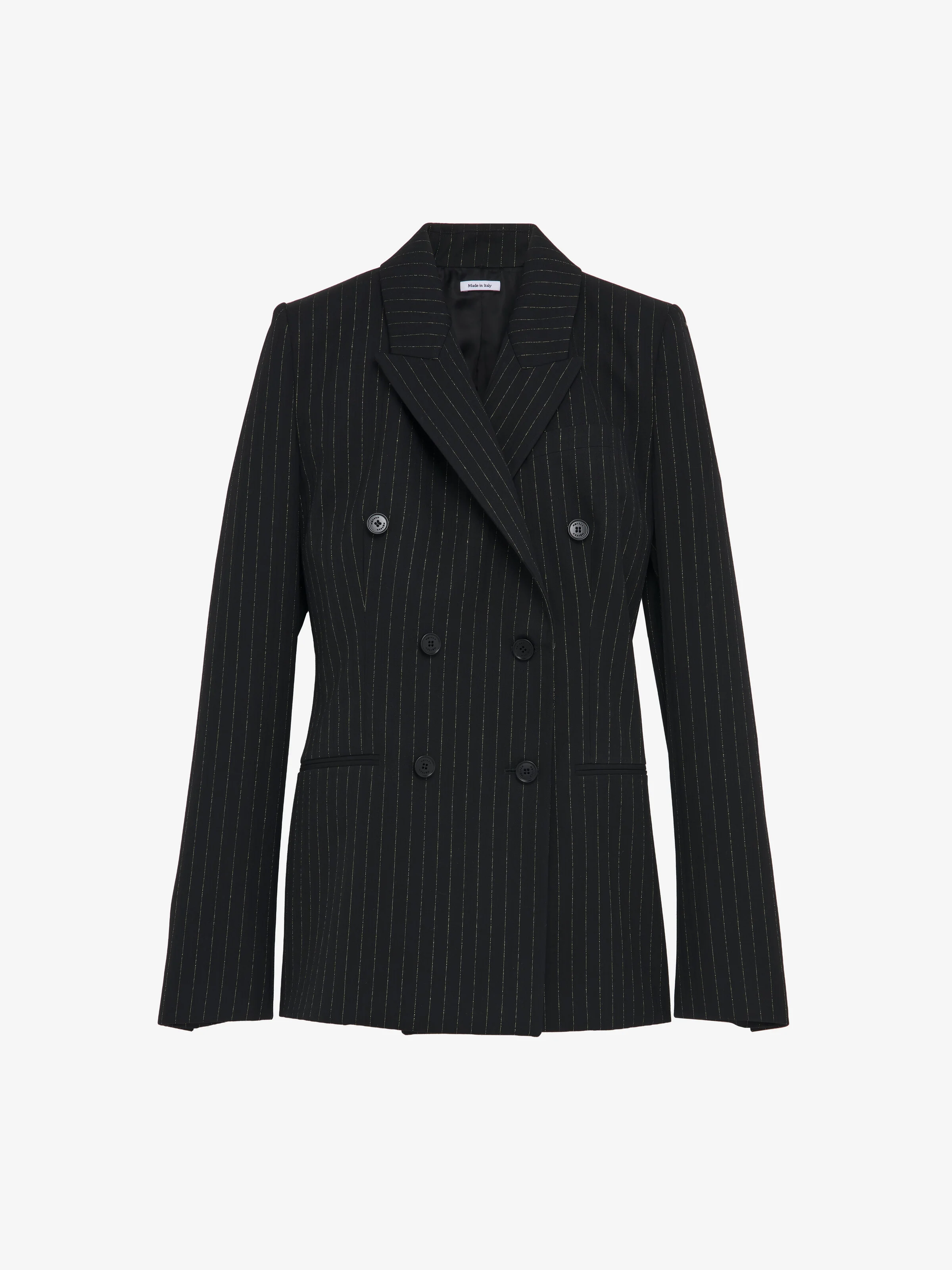 Double-breasted jacket in black featuring a metallic gold pinstripe pattern. Peak lapels, slit pocket on the chest and side jetted pockets. Finished with a T-Bar chain back detail. Complete the look with the matching trousers. Product details - Peak lapels - Chest pocket - Button fastening - Product code: 857603QJAFX1389 - Made in ITALY - Material: 100% Wool