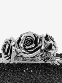 The Rose Knuckle Clutch – handcrafted with all-over black faceted crystal embroidery, featuring over 1800 crystals applied to a black satin base. Finished with silver-tone metal handle featuring an arrangement of sculptural English roses and signature knuckle rings. Can be worn handheld. Product details - Dimensions: 10 x 18 x 5 cm / 3.9 x 7 x 1.9 inches - Silver-finished handle adorned with with a sculpted rose - Black suede leather lining - Brass hardware with antique silver finishing - Due to the appearance of the product, we recommend stowing it in your hold luggage when passing through airport security. For the same reason we recommend not taking the bag to public places, such as law courts and sports stadiums, where there may be security checks. - Product code: 835586KR7861000 - Made in Italy - Material: 72% Viscose, 28% Silk