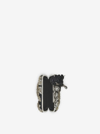 The Rose & Snake Knuckle Clutch – handcrafted with three-dimensional floral embroidery featuring over 2000 tonal crystals in various sizes, embroidered onto a black leather base. Signature knuckle rings are finished with a sculptural motif of a snake coiled around the stem of a singular rose, cast in silver-tone metal and with hand-applied black varnish and crystals. Can be worn handheld. Product details - Dimensions: 10 x 18 x 5 cm / 3.9 x 7 x 1.9 inches - Silver-finished handle adorned with black varnish and black strass sculpted rose - Black suede leather lining - Brass hardware with antique silver finishing - Due to the appearance of the product, we recommend stowing it in your hold luggage when passing through airport security. For the same reason we recommend not taking the bag to public places, such as law courts and sports stadiums, where there may be security checks. - Product code: 835585KR7831090 - Made in Italy - Material: 100% Lamb Leather