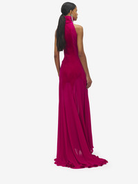 Evening dress in fuchsia silk georgette. High neck with gathered detailing and semi-sheer long skirt with train. Finished with a button and zip fastening on the back. Product details - High neck - Semi-sheer skirt with train - Back button and zip fastening - Product code: 842905QBADS5096 - Made in ITALY - Material: 100% Silk