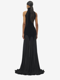 Evening dress in black silk georgette. High neck with gathered detailing and semi-sheer long skirt with train. Finished with a button and zip fastening on the back. Product details - High neck - Semi-sheer skirt with train - Back button and zip fastening - Product code: 842905QBADS1000 - Made in ITALY - Material: 100% Silk