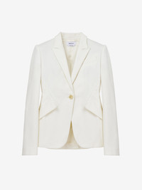 Single-breasted jacket in optical white stretch denim. Peak lapels, chest pocket and two side flap pockets. Finished with tonal topstitching and raw edge detailing. Complete the look with the matching jeans. Product details - Peak lapels - Side flap pockets - Single button fastening - Product code: 830574QZAON9000 - Made in Italy - Material: 98% Cotton, 2% Elastane
